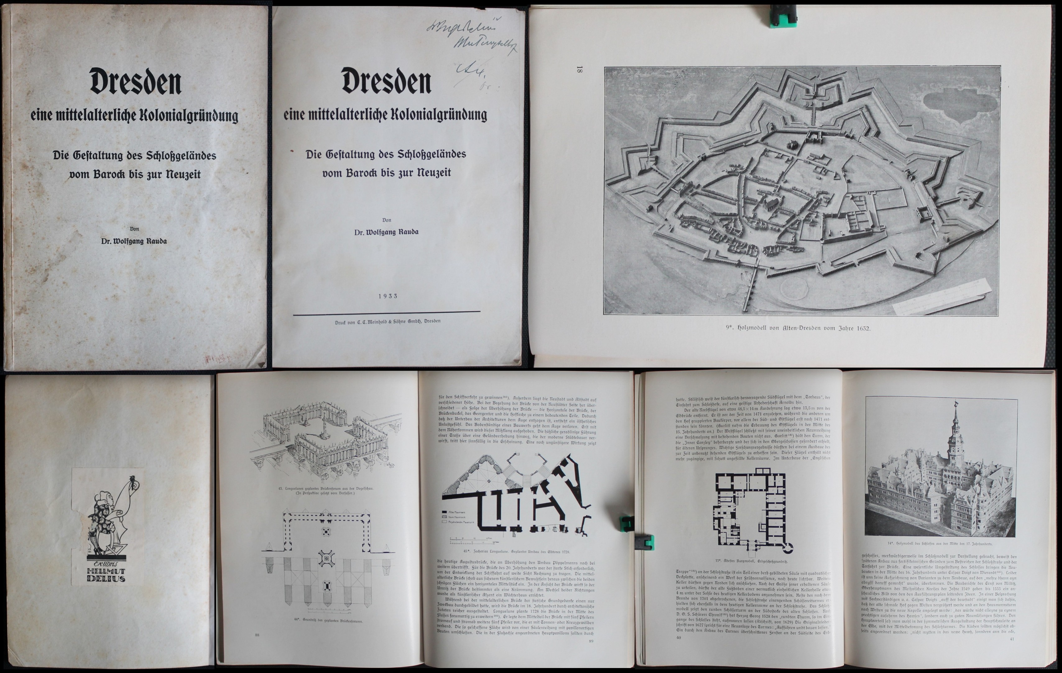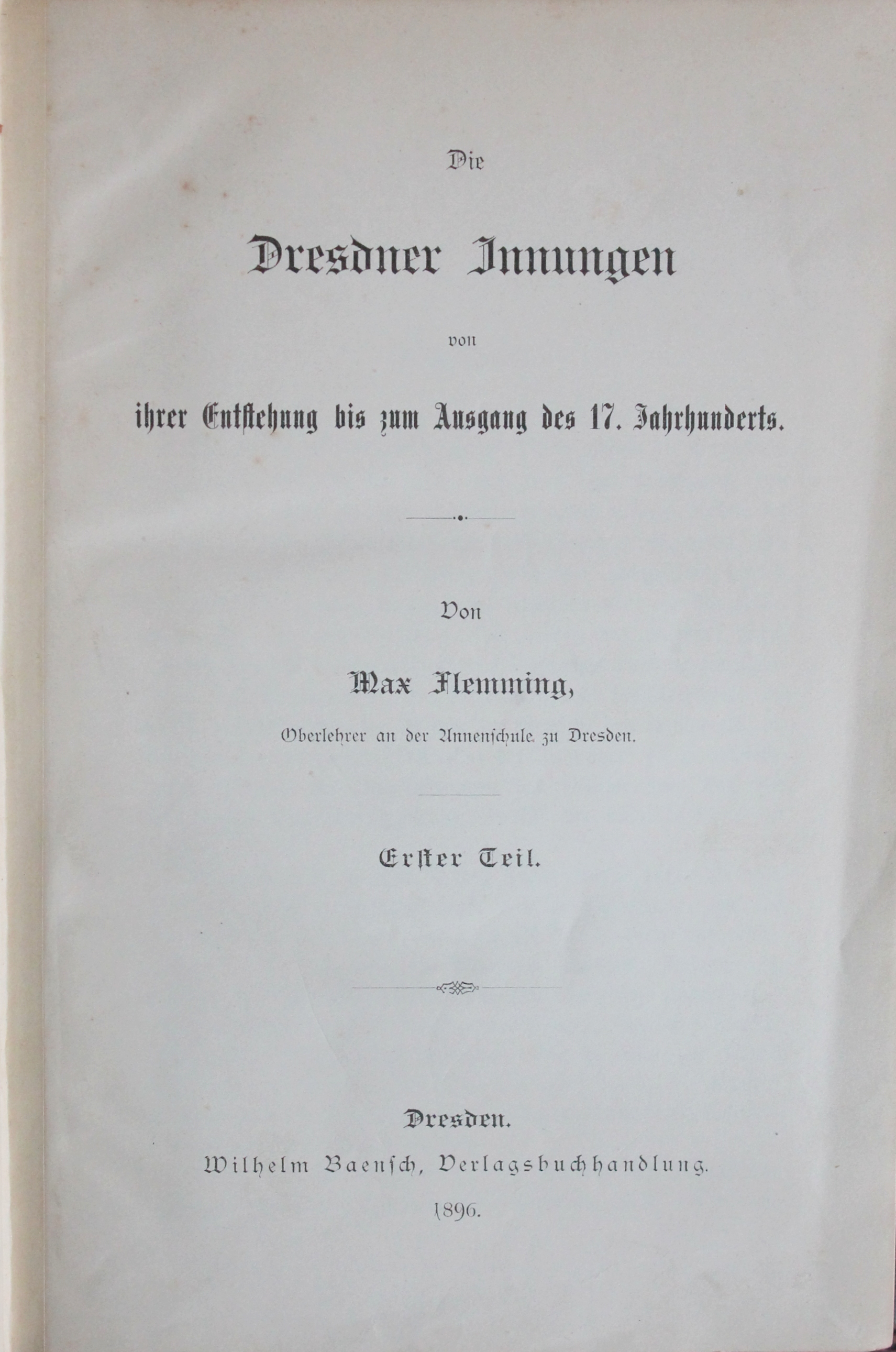 . Sammelband mit 3 Schriften zur Geschichte Dresdens, enthält: Felmming, Max. Die Dresdner Innungen von Ihrer Entstehung bis zum Ausgang des 17. Jahrhunderts - Erster Teil. angeb.: Friesen, Ernst Freiherr von. Die Lage in Sachsen während der Schwedischen Invasion 1706 und 1707 und der Friede von Altranstädt. angeb.: Haug, Heinrich. Das kurfürstliche Amt Dresden vom 14. bis zum 19. Jahrhundert. Dresden, Wilhelm Baensch, 1896/1901/1902. 8°, XI, 308 S.; VII, 125(1)S.; IV, 80 S., HLn. d. Zt. Die einzelnen Werke erschielen als Hefte 12-16 der Mitteilungen des Vereins für Geschichte Dresdens. Einband gering berieben, kaum bestossen, Rücken etwas aufgehellt. Papier altersbedingt leicht gebräunt, sehr vereinzelt minimal braunfleckig. Gutes Exemplar. Bestell-Nr: 8-1-167..........verkauft | ![]() | |