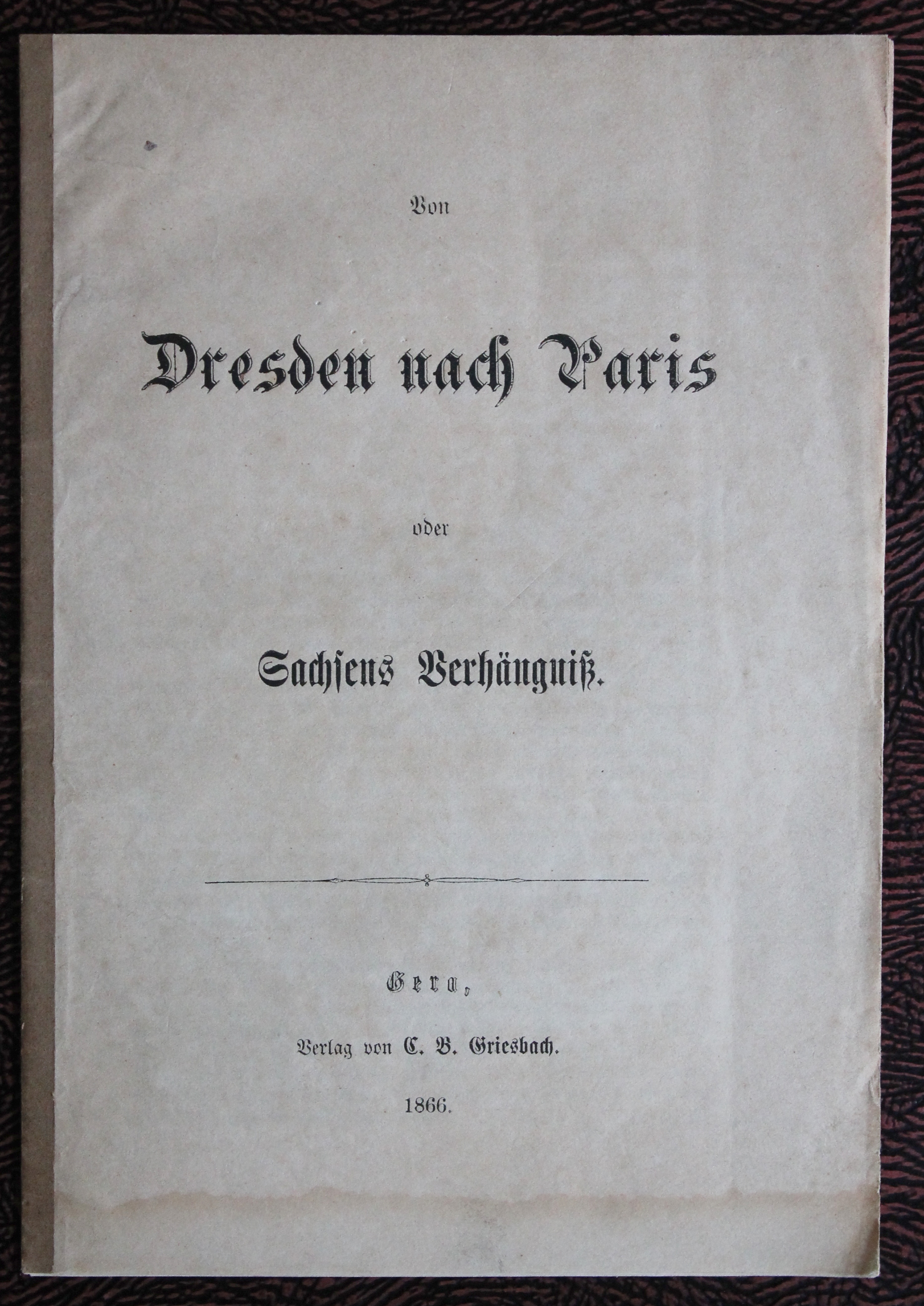 Anonym. Von Dresden nach Paris oder Sachsens Verhängniß. Gera, C. B. Griesbach, 1866. 8°, 15(1) S., Rückenbroschur d. Zt. Einzige Ausgabe. Ein Versuch der Schuldzuweisung von Sachsens Verhängnis im Ausgang des deutsch-deutschen Krieges 1866. Papierbedingt etwas gebräunt, im unteren weissen Rand etwas feuchtigkeitsrandig. Bestell-Nr: 8-1-139..........80,00 € (inkl. MwSt. zzgl. Versand) | ![]() | |