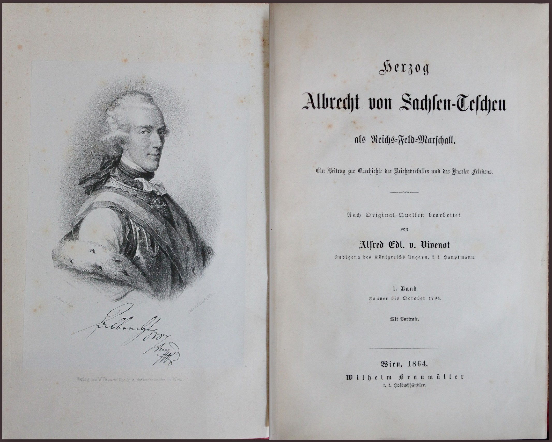 Vivenot, Alfred Edl. v.. Herzog Albrecht von Sachsen-Teschen als Reichs-Feld-Marschall. Ein Beitrag zur Geschichte des Reichsverfalls und des Baseler Friedens. 1. Band Jänner bis October 1794.. Wien, Wilhelm Braumüller, 1864. 8°, 1. Band (von 2) mit Portrait, XXI, 438 S., goldgp. Hln.. Einband leicht berieben und bestoßen. Papierbedingt gebräunt und teilweise braunfleckig. Insgesamt noch sehr gutes Exemplar.. Bestell-Nr: 8-1-140..........verkauft | ![]() | |