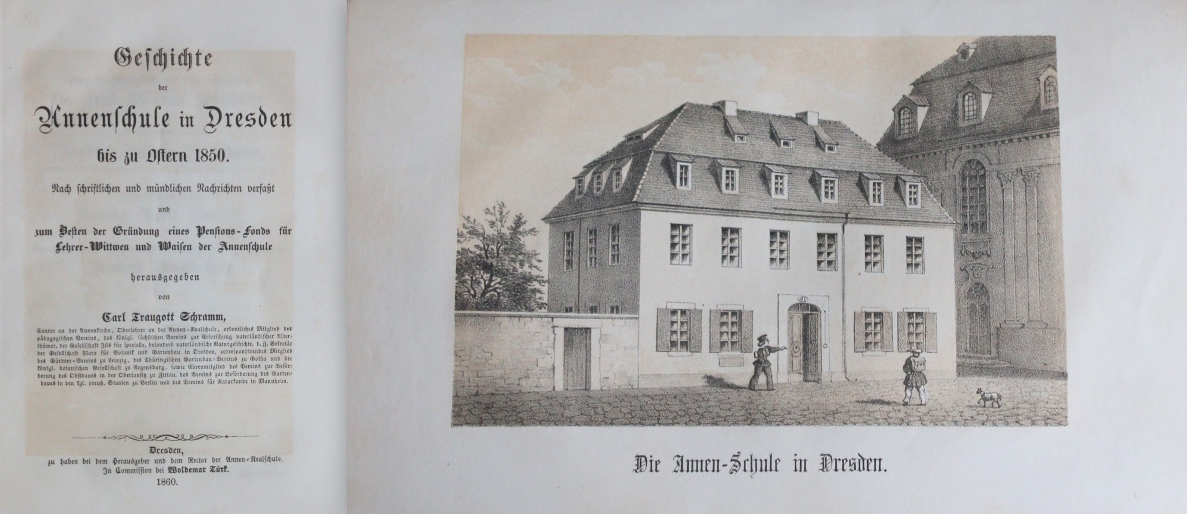 Schramm, Carl Traugott (Hrsg.). Geschichte der Annenschule in Dresden bis zu Ostern 1850. Nach schriftlichen und mündlichen Nachrichten verfaßt.... Dresden, Woldemar Türk, 1860. 8°, mit einer Lithografie der Annen-Schule Dresden, VI, 137 S., Brosch. Einband leicht berieben, teilweise fleckig. Papierbedingt leicht gebräunt und vereinzelt etwas braunfleckig. Insgesamt sehr gutes Exemplar.. Bestell-Nr: 8-1-147..........120,00 € (inkl. MwSt. zzgl. Versand) | ![]() | |