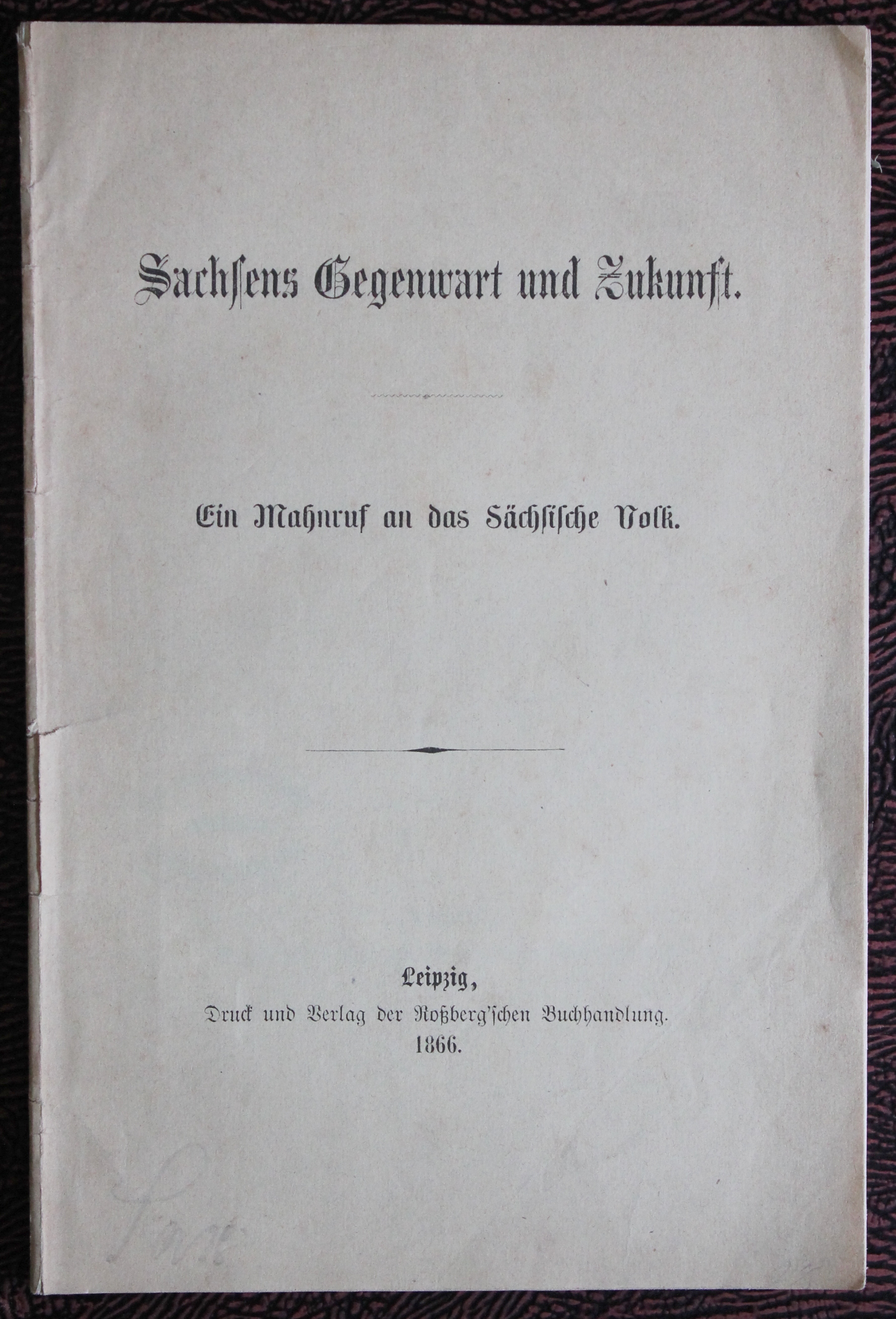 Anonym. Sachsens Gegenwart und Zukunft. Ein Mahnruf an das Sächische Volk.. Leipzig, Roßberg, 1866. 8°, 35 S., OBrosch.. Einzige Ausgabe. Ein Versuch der Erklärung der Zukunfts Sachsens zusammenhängend mit dem Ausgang des deutsch-deutschen Krieges 1866. Einband leicht berieben und bestoßen und teilweise leicht fleckig. Titelblatt mit kleinen, alten Stempel. Papierbedingt etwas gebräunt und vereinzelt leicht braunfleckig. Insgesamt noch sehr gutes Exemplar.. Bestell-Nr: 8-1-148..........verkauft | ![]() | |