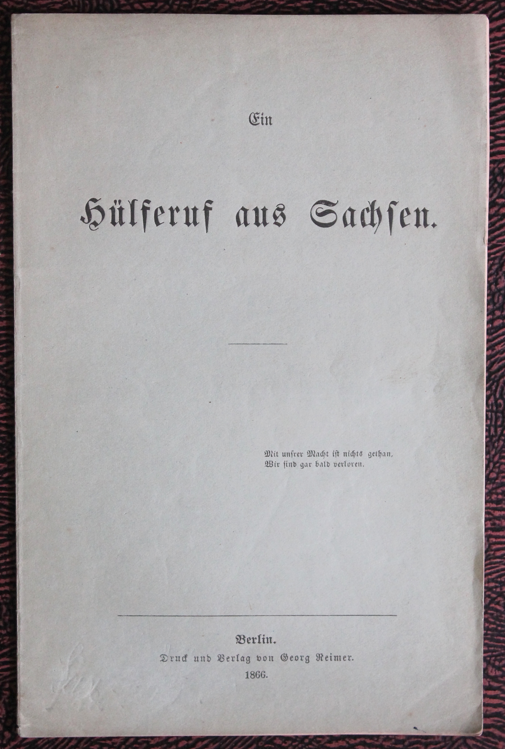 Anonym. Ein Hülferuf aus Sachsen.. Berlin, Georg Riemer, 1866. 8°, 16 S., OBrosch.. Einzige Ausgabe. Ein Versuch der Erklärung der politischen Folgen und Zukunfts Sachsens zusammenhängend mit dem Ausgang des deutsch-deutschen Krieges 1866. Einband leicht berieben und bestoßen und teilweise leicht fleckig. Titelblatt mit kleiner Fehlstelle im weißen Rand. Papierbedingt etwas gebräunt und vereinzelt leicht braunfleckig. Letztes Blatt beschnitten. Insgesamt noch sehr gutes Exemplar.. Bestell-Nr: 8-1-149..........verkauft | ![]() | |