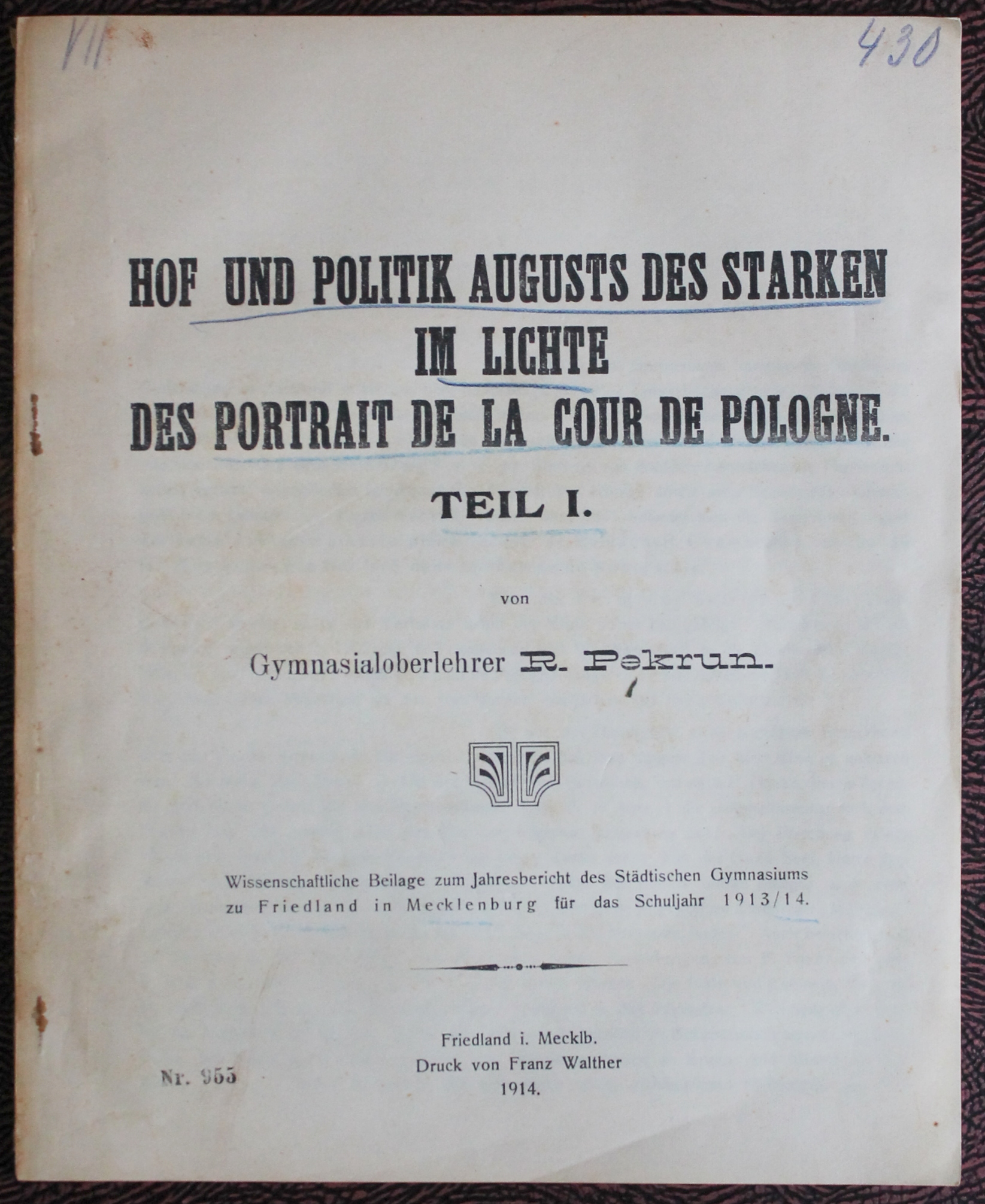 Anonym [Daniel, Erhard Christian]. Nöthige Erinnerungen an den Verfasser des anonymischen an Se. Churfürstl. Durchl. zu Sachsen gerichteten Aufsatzes über die Annahme der Pohlnishen Krone. Leipzig, Voß und Leo, 1792. kl. 8°, 60 S., Brosch.. Holzmann/ Bohalta II/ 1540 - Broschureinband leicht berieben und bestoßen, stellenweise fleckig, mit kleinem, alten Bibliotheksaufkleber und handschriftlichem Titel. Titelblatt und verso mit kleien, alten Stempeln. papierbedingt gebräunt und vereinzelt etwas braunfleckig.. Bestell-Nr: 8-1-178..........190,00 € (inkl. MwSt. zzgl. Versand) | ![]() | |
