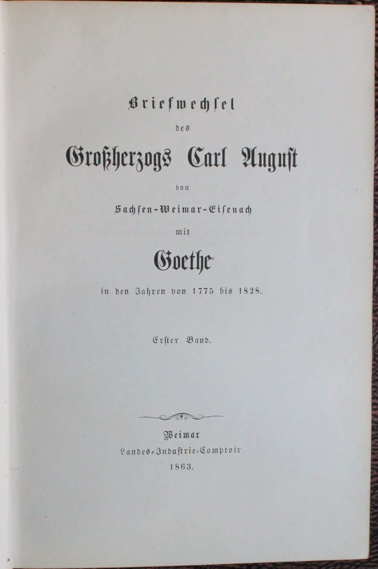 Anonym [Hofrat Karl Vogel]. Briefwechsel des Großherzogs Carl August von Sachsen-Weimar-Eisenach mit Goethe in den Jahren von 1775 bis 1828. 2 Bände. Weimar, Landes-ndustrie-Comptoir, 1863. 8°, VIII, 320 S.; 2 Bll., 335(1) S., HLdr. d. Zt. Goedeke IV/2, 707, 3 - Erste Ausgabe dieses 639 Briefe umfassenden Briefwechsels, welches Goethes letzter Arzt, der Weimarer Hofrat Karl Vogel herausgab. Einbände etwas betrieben und bestossen. Papierbedingt leicht gebräunt, gute Exemplare. Bestell-Nr: 8-1-161..........verkauft | ![]() | |
