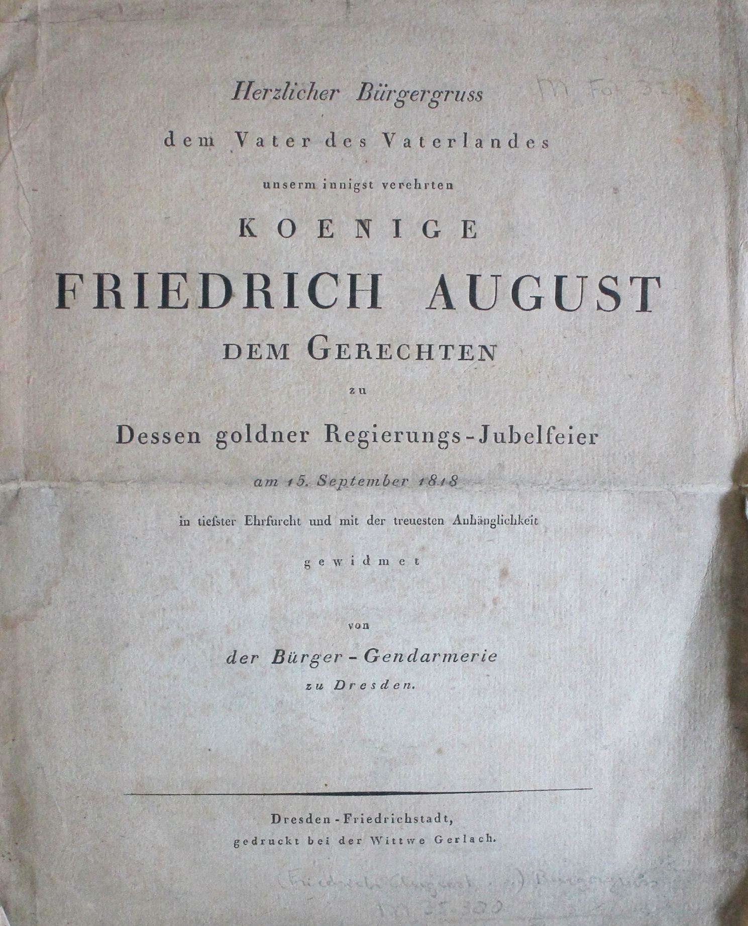 Anonym (Bürger-Gendarmerie zu Dresden). Herzlicher Bürgergruss dem Vater des Vaterlandes unserm innigst verehrten Koenige Friedrich August dem Gerechten zu dessen goldener Regierungs-Jubelfeier am 15. September 1818 in tiefster Ehrfurcht und mit der treuesten Anhänglichkeit. Dresden-Friedrichstadt, gedruckt bei der Witwe Gerlach, 1818. 4°, 4 Bll. le. w., OBroschur. Papierbedingt gebräunt und fleckig. Am Gelenk etwas eingerissen. Knickfalte quer und mittig. Seitenränder teilweise ausgefranst und mit kleinen Einrissen. Insgesamt gut erhaltenes Exemplar.. Bestell-Nr: 8-1-163..........100,00 € (inkl. MwSt. zzgl. Versand) | ![]() | |