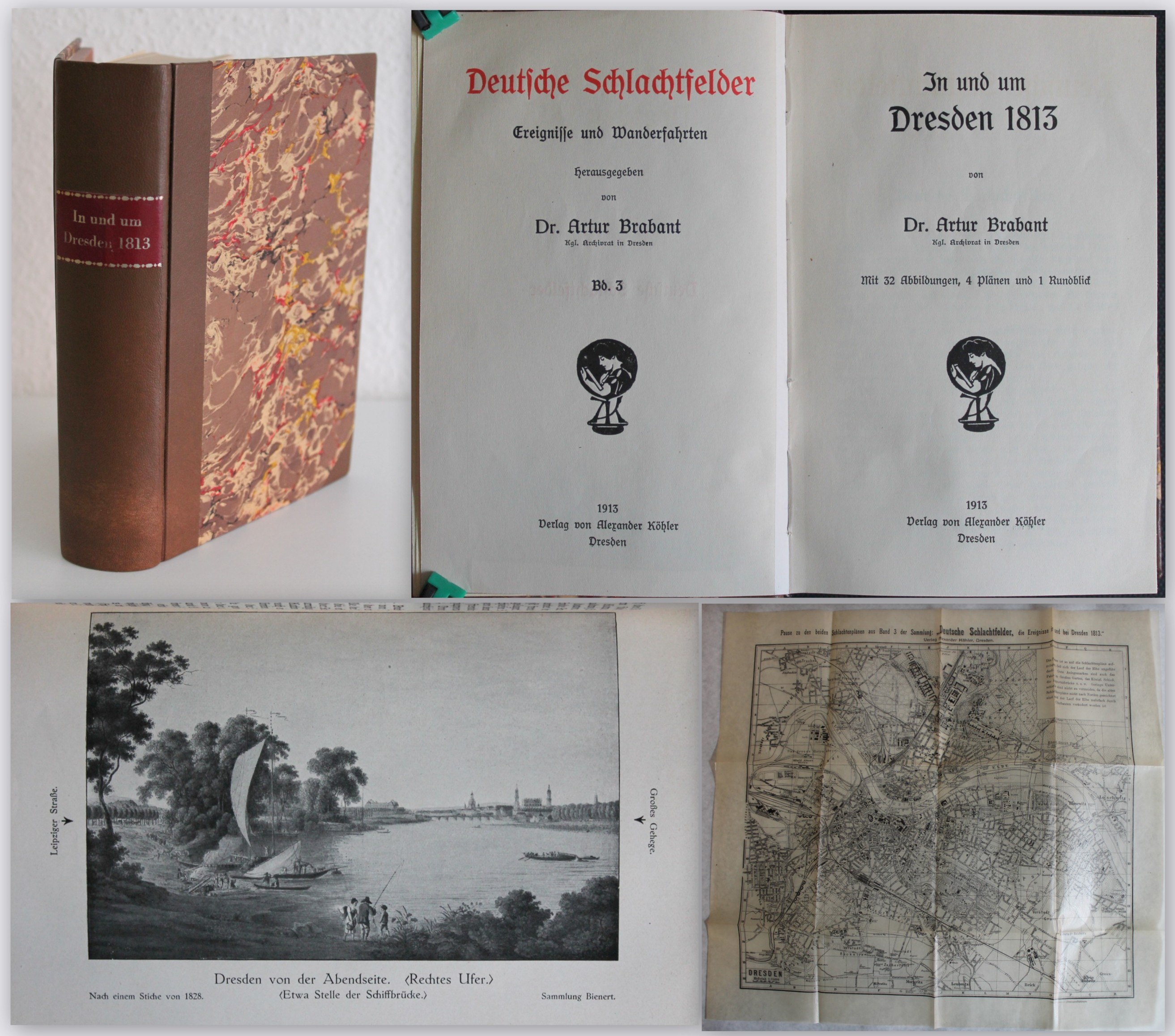 Aster, Heinrich. Schilderung der Kriegsereignisse in und vor Dresden, vom 7. März bis 28. August 1813. Dresden und Leipzig, Arnoldische BH, 1844. 8°, X, 9 Bll., 356 S., geflammt marmorierter Pppbd. mit goldgepr. Rücken und RS. Einzige Ausgabe. Einband an Gelenk und Ecken berieben und etwas bestossen. Papierbedingt etwas gebräunt, sehr vereinzelt minimalst braunfleckig, Titel und erstes Blatt im Rechten äußersten Rand mit kleinem Feuchtigkeitsfleck, Titel mit altem, hs. Besitzvermerk. Die beiden im Titel erwähnten Schlachtpläne wie so oft nicht beigebunden. Bestell-Nr: 8-1-166..........verkauft | ||