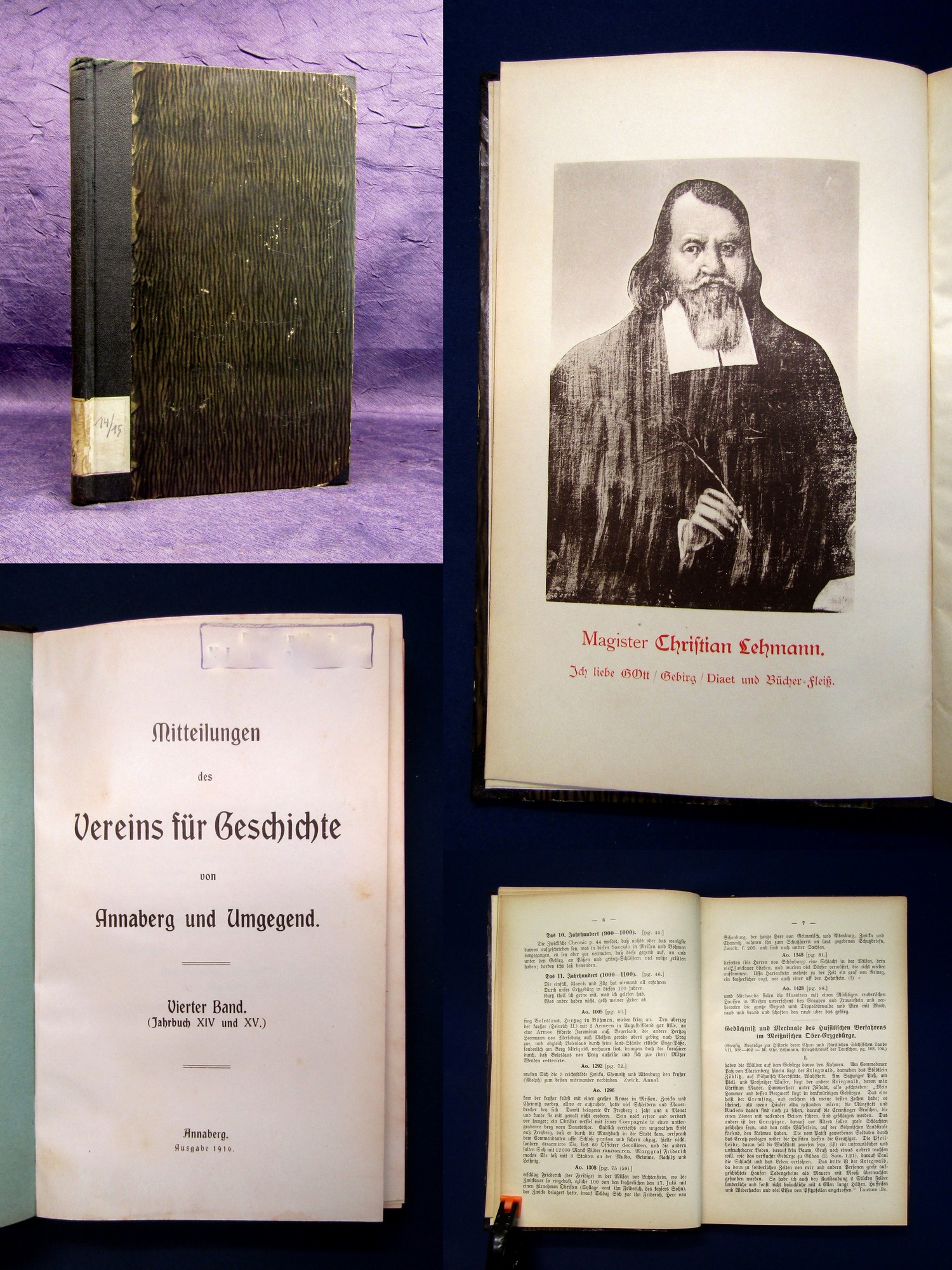 Autorenkollektiv. Mitteilungen des Vereins für Geschichte von Annaberg und Umgegend. 3. Band, Heft 1-3 (alles), enthält u.a.: Bönhoff, Albinus, Annabergische Annales [...]; Wolf, Aus dem kirchlichen Leben Annabergs in vorreformatorischer Zeit [...]; Fink, Annaberger Strassenbenennung [...]; Meier, Annaberger Studenten [...] in Leipzig und Wittenberg; Zur Geschichte des Vereins; Harms zum Spreckel, Beiträge zur Geschichte der Famile Röhling; v. Elterlein, Ausgang der Familie von Elterlein; Heilmann, Namensverzeichnis sämtlicher Annaberger Ratsherren [...]. Annaberg, Grasersche BH, 1910. 8°, mit 19 (teils ausfaltbaren) Tafeln und Holzschnittitel (Heft 2), 426 S., 2 Bll., HLn. d. Zt. Schlichter Bibliothekseinband der Zeit mit geringen Gebrauchsspuren und Bibliotheksschildchen am Rücken. Papier altersbedingt etwas gebräunt. Originalbroschuren beigebunden. Broschurtitel und 1. Titel mit altem Bibliotheksstempel. Gutes Exemplar, selten. Bestell-Nr: 8-1-387..........verkauft | ||