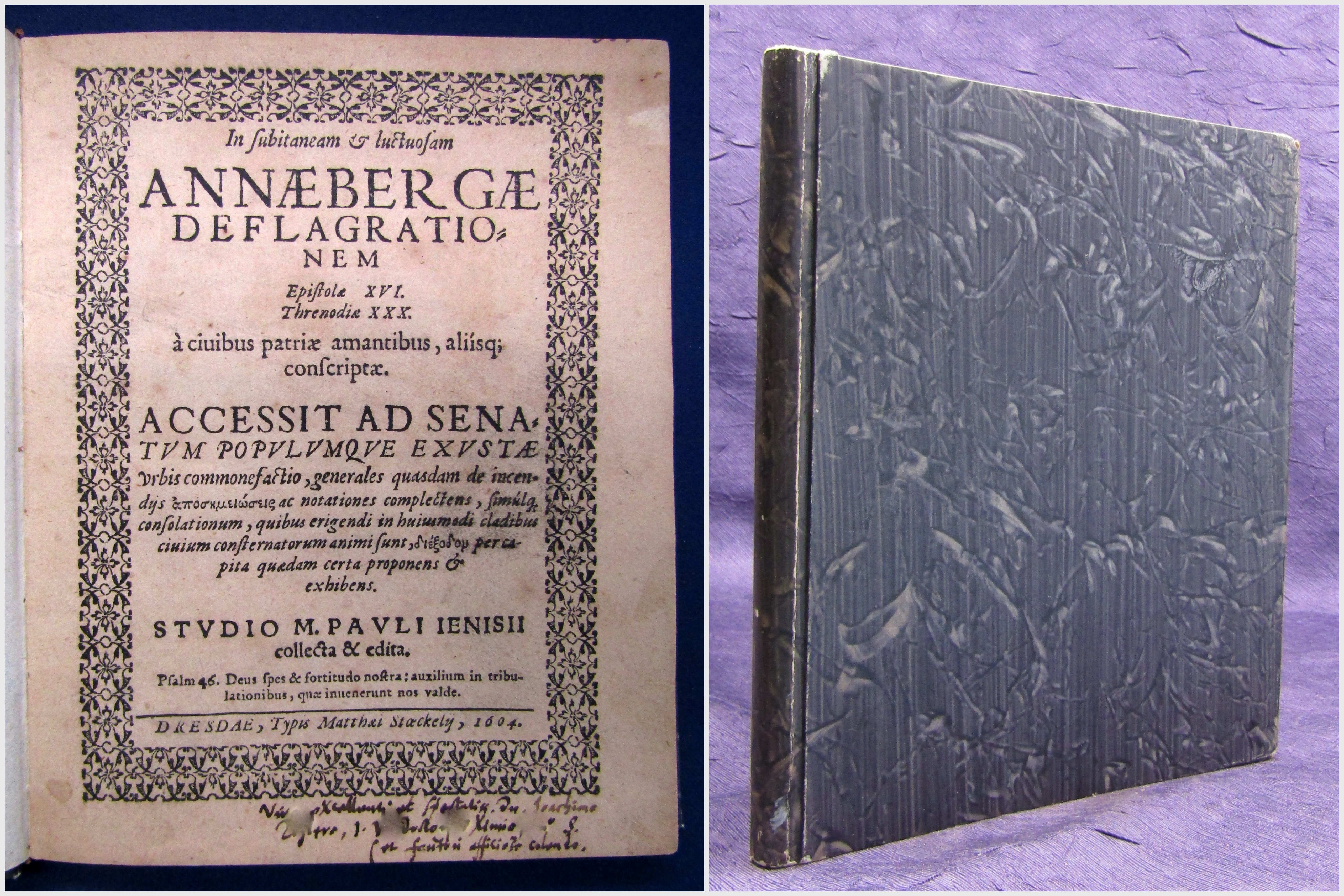 Albinus, Petrus (d.i. Peter Weis). Meisznische Land und Berg-Chronica, in welcher ein vollnstendige description des Landes, so zwischen der Elbe, Sala und südödischen Behmischen gebirgen gelegen, so wol der dorinnen begriffenen [...] Bergwercken, sampt zugehörigen Metall un[d] Metallar beschreibungen. 2 Tle. in 1 Band. Dresden, G. Bergen d. Ä., 1589-1590. kl. Folio, mit 2 Holzschnitt-Titelbordüren, 2 Holzschnitt-Karten, 6 Porträt-Holzschnitten, 59 Wappen-Holzschnitten u. 2 blattgroßen Porträt-Kupfern. 6 Bll., 449 SS., 1 nn. S., 7 Bll., ; 4 Bll., 205 SS., 1 nn. S., 3 Bll. flexibler Pgt. mit Bindebändern. VD16 W 1678. Ferchl 6. Poggendorff 1, 24. Haebler (Einband:) I, S. 275, I u. II; S. 278, I u. II. - Einzige Ausgabe und bedeutendes Quellenwerk für die Bergwerks- und Hüttengeschichte sowie für die Landeskunde. Enthält im ersten Teil die Land-, im zweiten die Bergchronik. Albinus (1543-98) war Sekretär und Archivar des sächsischen Kurfürsten. Vorliegendes ist sein Hauptwerk und eine "Quelle über das Leben Agricolas" (Ferchl). Einband berieben, angestaubt, etwas fleckig, teils leicht gewellt. Rücken mit hs. Titel, hinteres Gelenk unten mit kleiner Wurmspur. Bindebänder erneuert. Papier altersbedingt etwas gebräunt, vorderer Spiegel mit alter hs. Eintragung. Sauberes Exemplar . Bestell-Nr: 8-1-322..........verkauft | ||