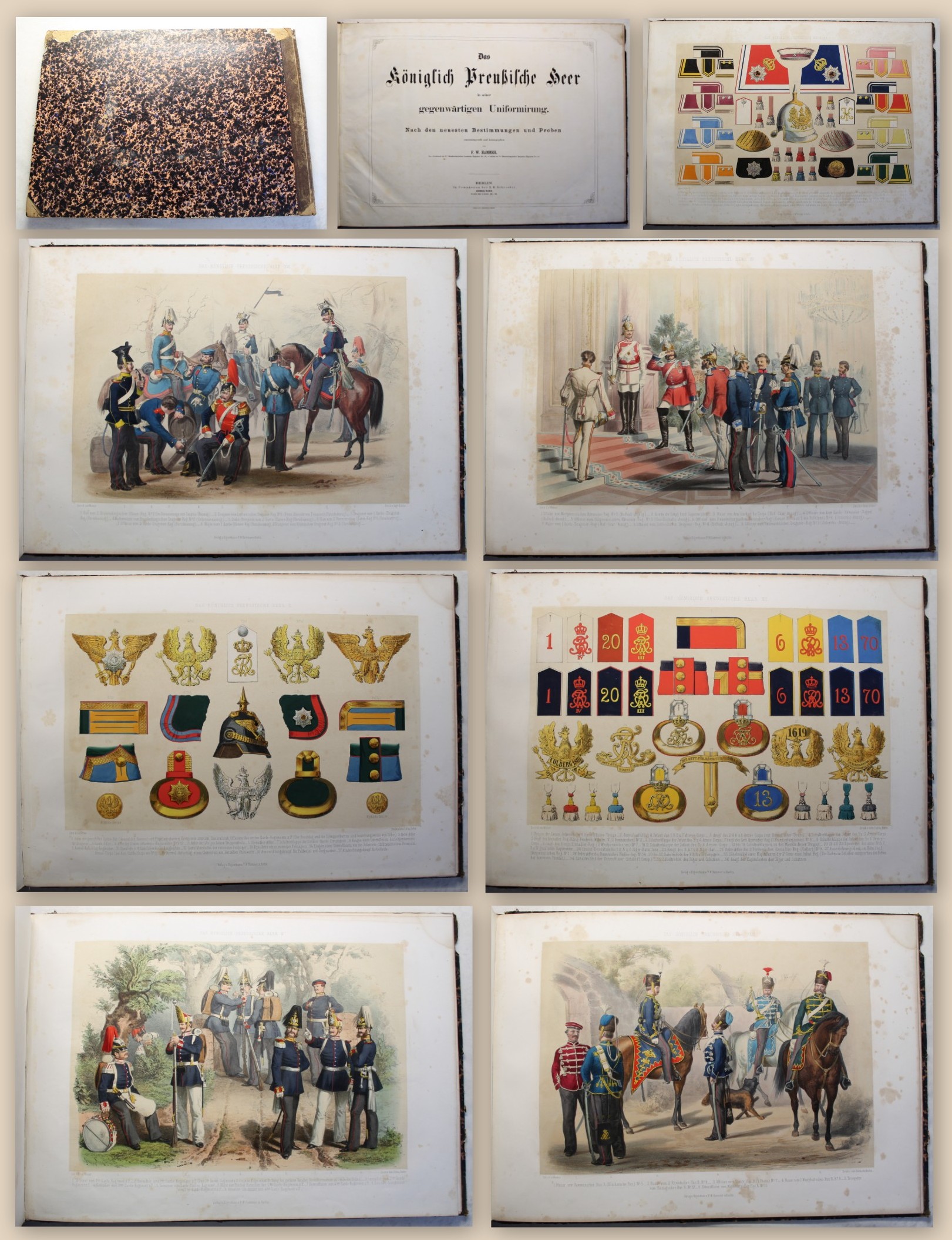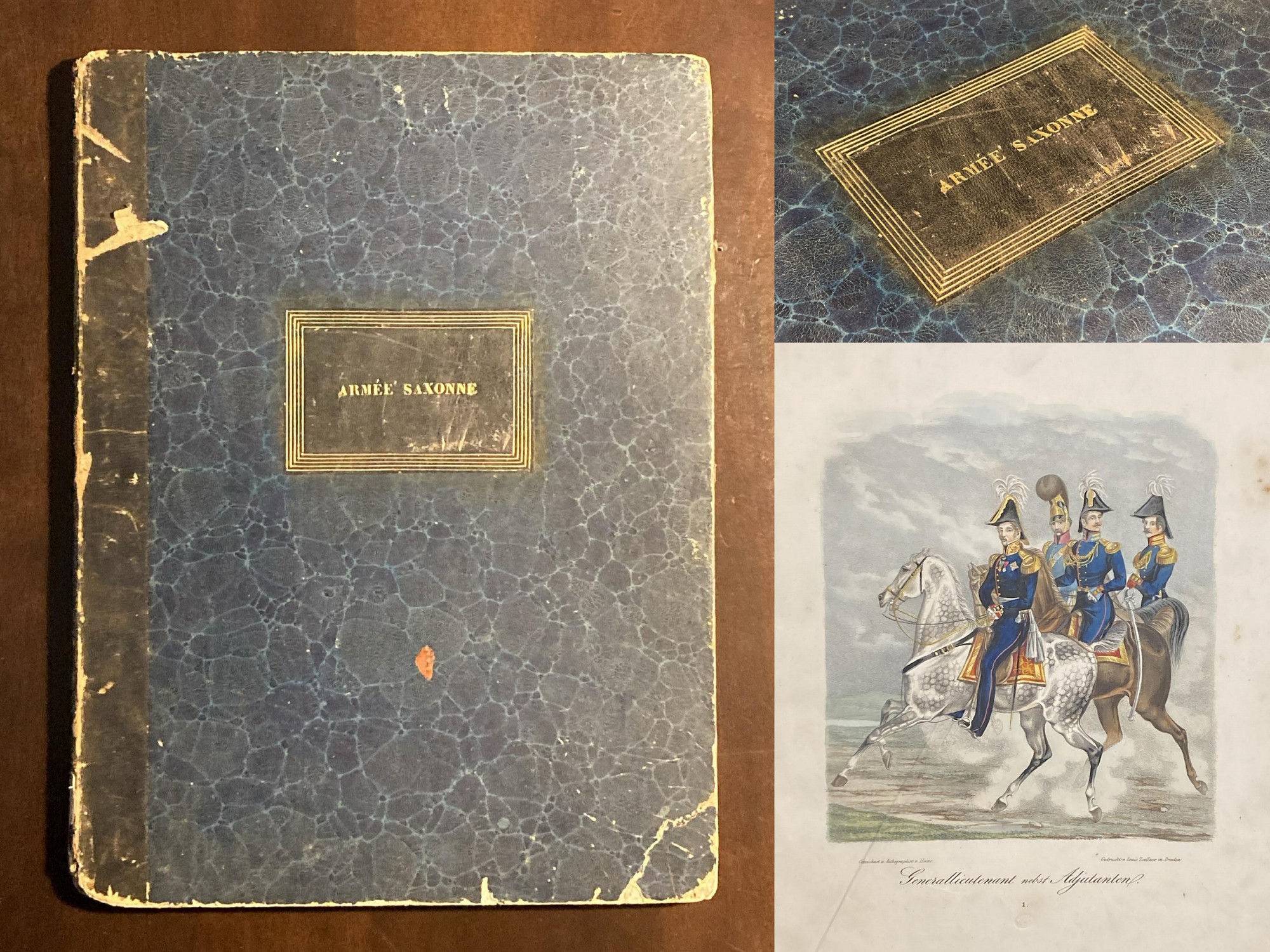 [Anonym] - Uniformkunde / Militaria. Accurate Vorstellung der säm(m)tlichen ChurFürstl. Sächß. Regimenter und Corps: Worinnen zur eigentl. Kenntniß der Uniform von jedem Regimente ein Officier und ein Gemeiner abgebildet sind [...], angeb.: Kurze Geschichte der Churfürstlich-Sächsischen Regimenter von ihrer Errichtung bis ans Ende des Jahres 1769 [...]. Nürnberg, Raspe, 1769. 8° (18:12,5 cm), mit gest. Titel und 33 kol. tls. gold- u. silbergehöhten Kupfertaf., 32 S., Ppbd. d. Zt. Einzige Ausgabe der seltenen Uniformkunde. Laut KVK nur in 2 deutschen Bibliotheken nachweisbar. - Einband berieben, bestoßen, tintenfleckig und mit kleiner Bezugsfehlstelle am oberen Rücken. Papier altersbedingt leicht gebräunt, 2 Taf, mit kleinen Tintenfleckchen ausserhab der Bilddarstellung, Taf. 11 etwas fleckig durch leicht verwischtes Kolorit. Textteil im äußeren Rand mit kleinen Tintenfleckchen und leichtem Feuchterand. Insgesamt gutes Exemplar des sehr seltenen Titels . Bestell-Nr: 8-1-493..........verkauft | ||