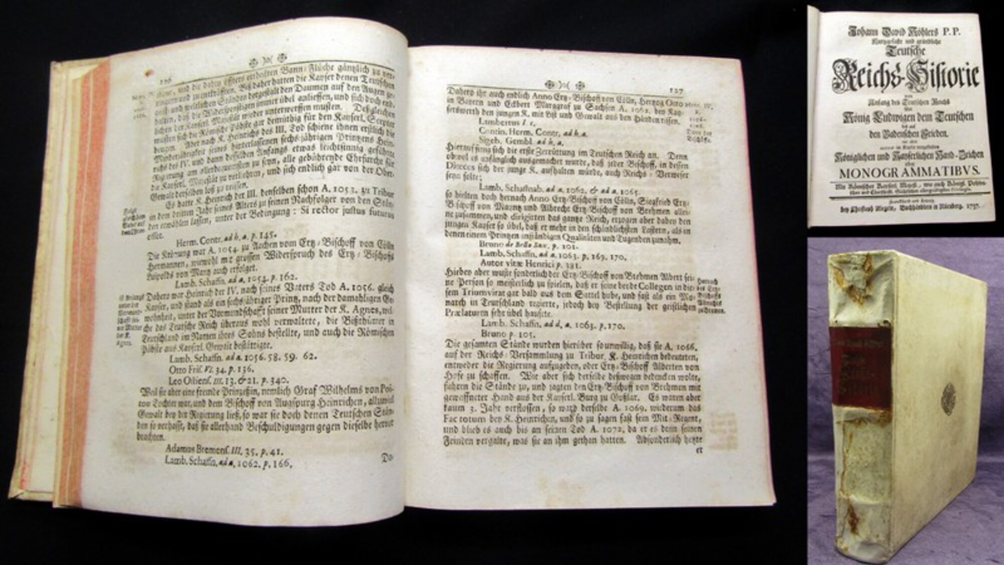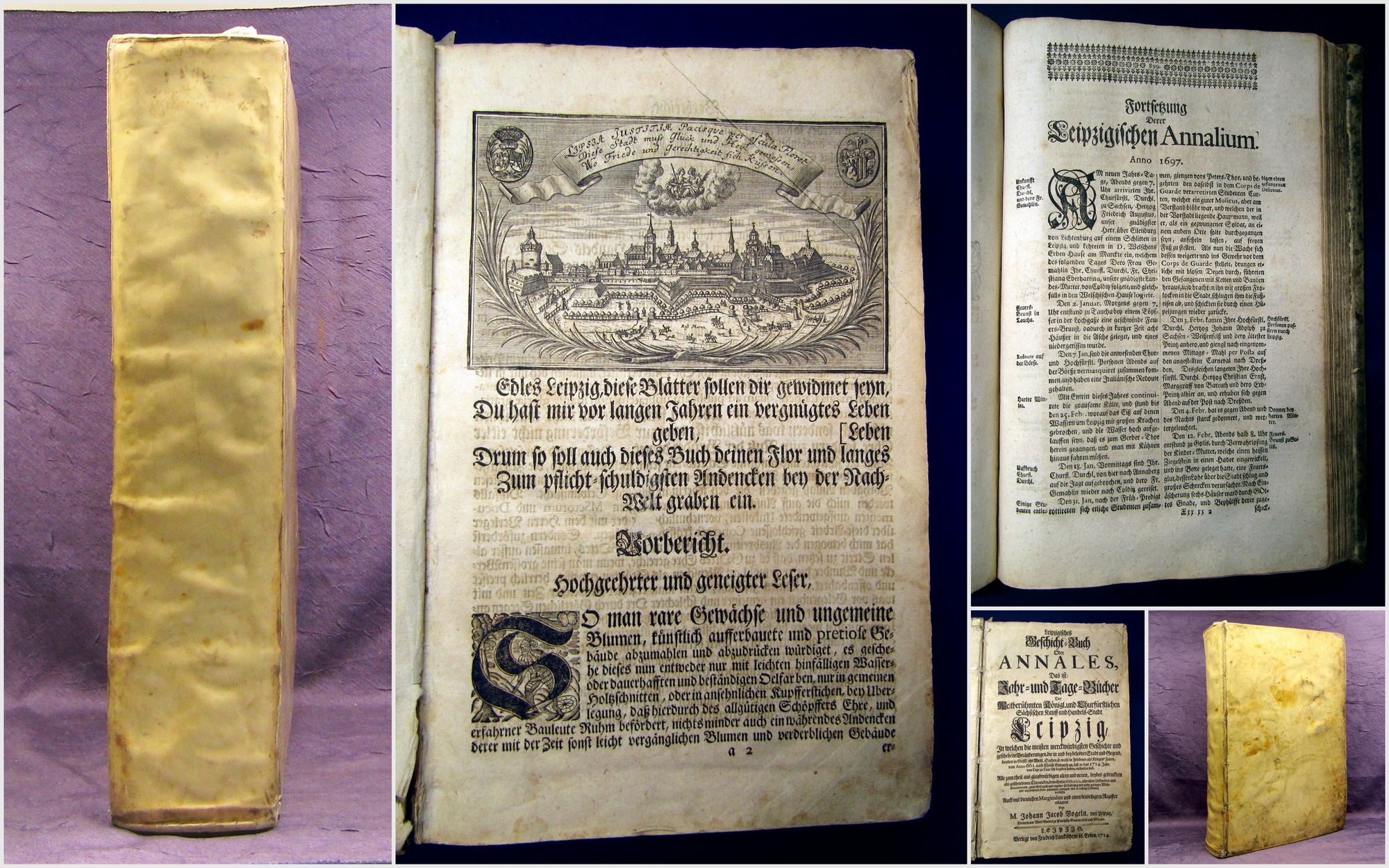 Vogel,J.J. Leipzigisches Geschicht-Buch oder Annales. Das ist Jahr- und Tage-Bücher der sächsischen Kauff- und Handels-Stadt Leipzig ... von Anno 661-1714 [...]. Leipzig, Lanckisch Erben, 1714. Folio, mit großer Kopfvignette (Ansicht von Leipzig) und 6 kleinen Holzschnitten, 5 Bl., 1079 (falsch 1077) S., 30 nn. Bll. (Register), Pgmt. d. Zt. Rothe-Heilemann I, 85. Hayn-Gotendorf IV, 134. ADB XL, 111 f. - Erste Ausgabe. - Umfangreiche, chronologisch geordnete Stadtchronik mit einer Vielzahl kulturgeschichtlicher Einzelheiten, verfasst von dem Leipziger Historiker Johann Jacob Vogel (1660-1729). "Am bekanntesten ist seine Lebensbeschreibung des Ablaßkrämers Tetzel und namentlich seine Leipziger Geschichte 'Annales Lipsiae' geworden" (ADB). - Einband gebräunt und fleckig, Gelenke teils angeplatzt. Durchgängig unterschiedlich gebräunt, zu Beginn etwas fingerfleckig und mit Quetschfalte, Titel etwas gelockert, ca. 4 Blatt mit kleiner Wurmspur in Quetschfalte. Blatt 1053/1045 mit geklebtem (Tesa) Einriss. Bestell-Nr: 8-1-480..........verkauft | ![]() | |