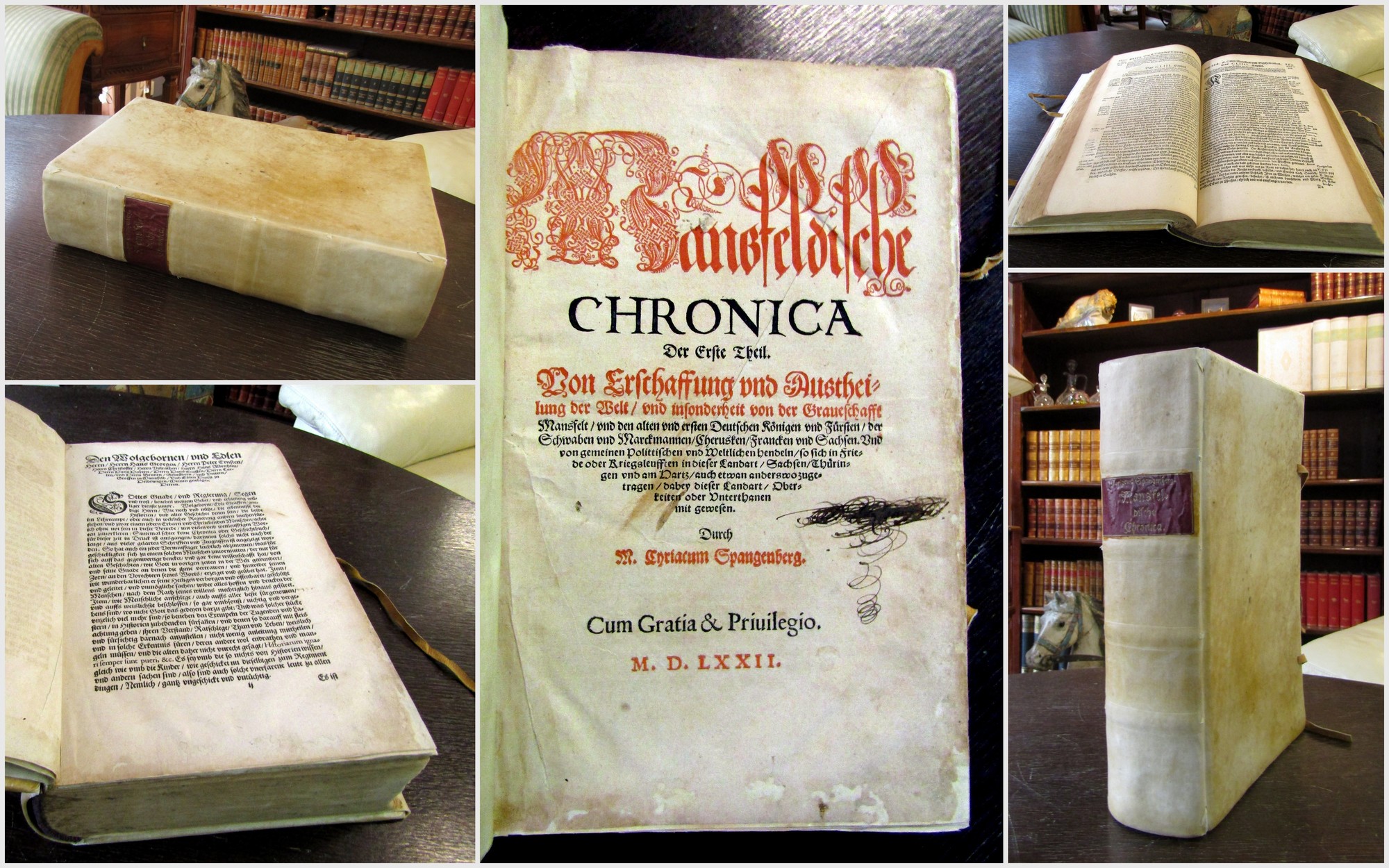 Spangenberg, Cyriacus. Mansfeldische Chronica. Erster Theil (alles Erschienene). Von Erschaffung und Austheilung der Welt, und insonderheit von der Graveschafft Mansfelt [...]. Eisleben, Andreas Petri, 1572. Folio, Titel in Rot und Schwarz, 5 nn. Bll., 502 (v.503) Bll., 50 (v. 51) Bll., neuerer Ganzpergament mit RS und Schließenbändern. VD16 S 7635. Goedeke II, 194. MNE II, 253 - Erste Ausgabe der umfangreichen Chronik der sächsischen Grafschaft Mansfeld. Die Berichte der Chronik enden 1571. Cyriacus Spangenberg (1528-1604) war Prediger und Lehrer in Eisleben. Neben historischen Schriften publizierte er auch theologischen Werke so etwa ein "Christlichs Gesangbüchlein". Spangenberg überarbeitet seine Chronik fortlaufend und publizierten 1585 eine bis 1566 erweiterte Fassung unter dem Titel "Sächsische Chronica". Weitere Teile der "Mansfeldischen Chronica" wurden erst im 19. Jahrhundert aus dem Manuskript ediert. - Einband mit geringen Gebrauchsspuren, ein Schließenband verkürzt. Papier gebräunt und etwas braunfleckig. Erste und letztes Blatt mit hinterlegten Rändern, letzte Blätter mit kleinen Wurmlöchern. Es fehlt das erste Textblatt und das letzte Blatt (Kolophon). Beide Blätter auf chamoisfarbenem Papier in Kopie beiliegend. Bestell-Nr: 8-1-496..........verkauft | ![]() | |