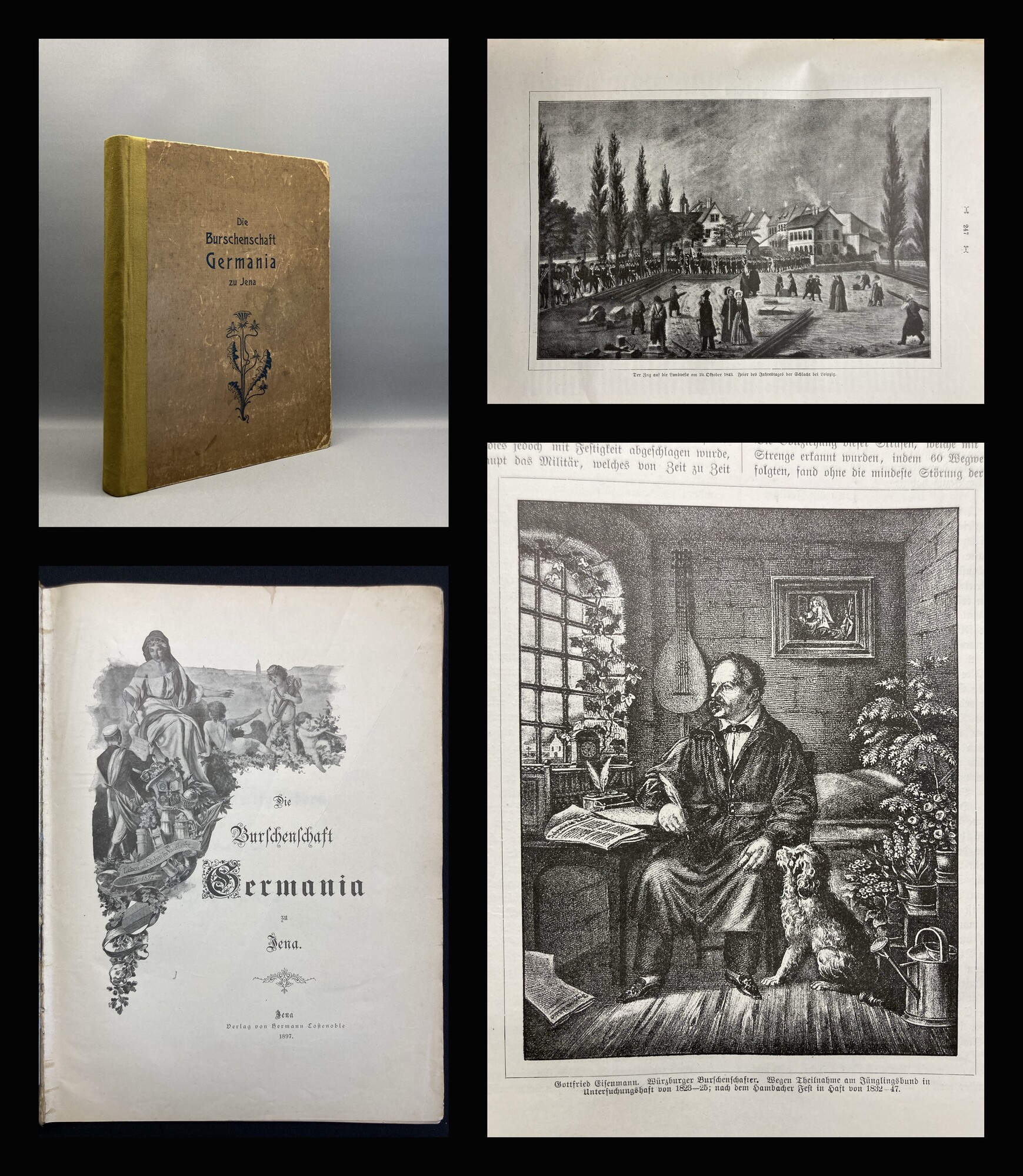 Schneider, Heinrich Just. Dr.. Die Burschenschaft Germania zu Jena. Jena, Hermann Costenoble, 1897. 4 ° (31x24 cm), Titel,(1), 579 s., restaurierter Halbleinen mit Symbol der Jenaer Burschenschaft. Burschenschaften sind traditionelle Studenetnevrbindungen, in Deutschland und Österreich.- Einband stärker berieben und bestoßen, Papier gering gebräunt. Bestell-Nr: 8-1-606..........100,00 € (inkl. MwSt. zzgl. Versand) | ![]() | |