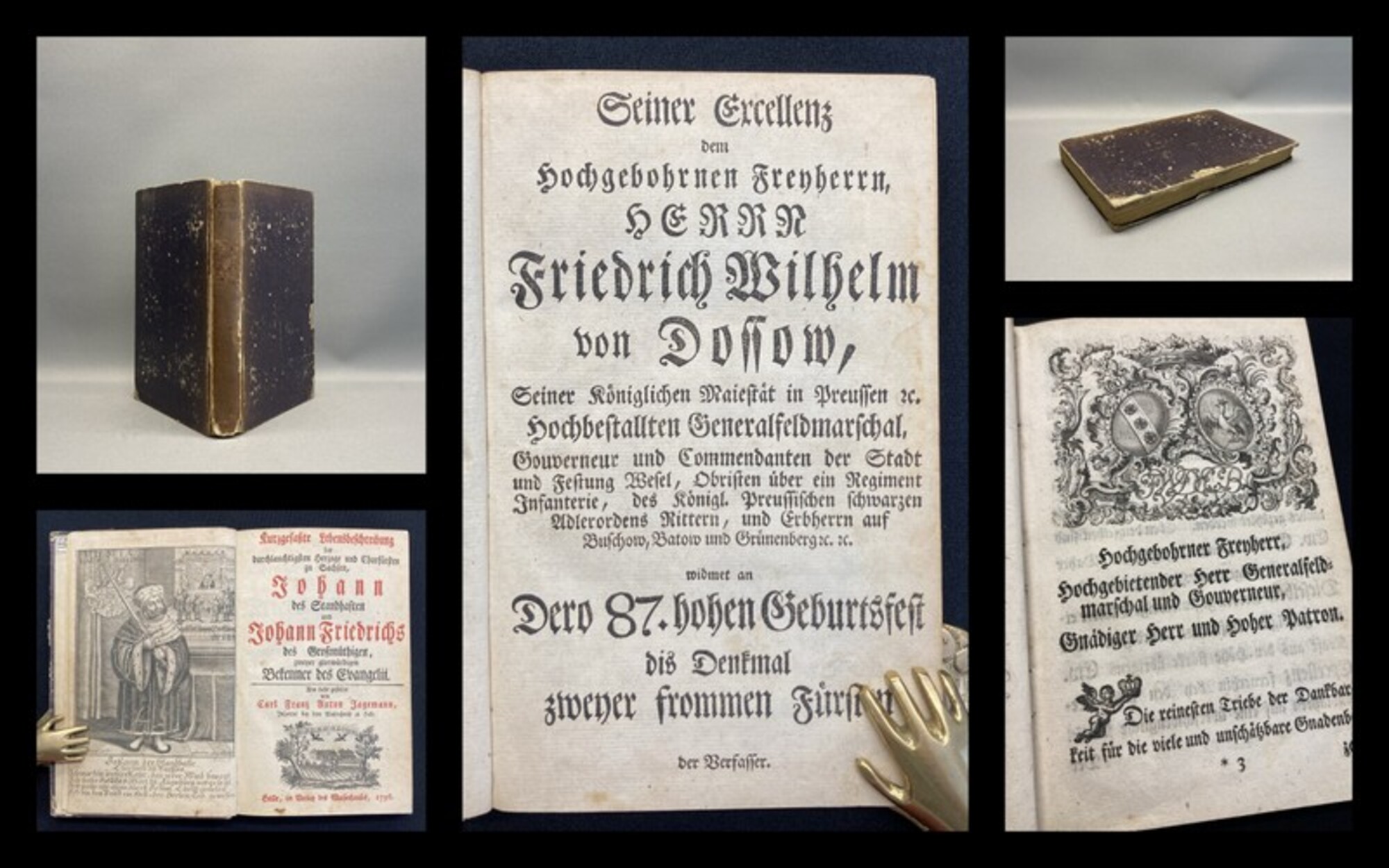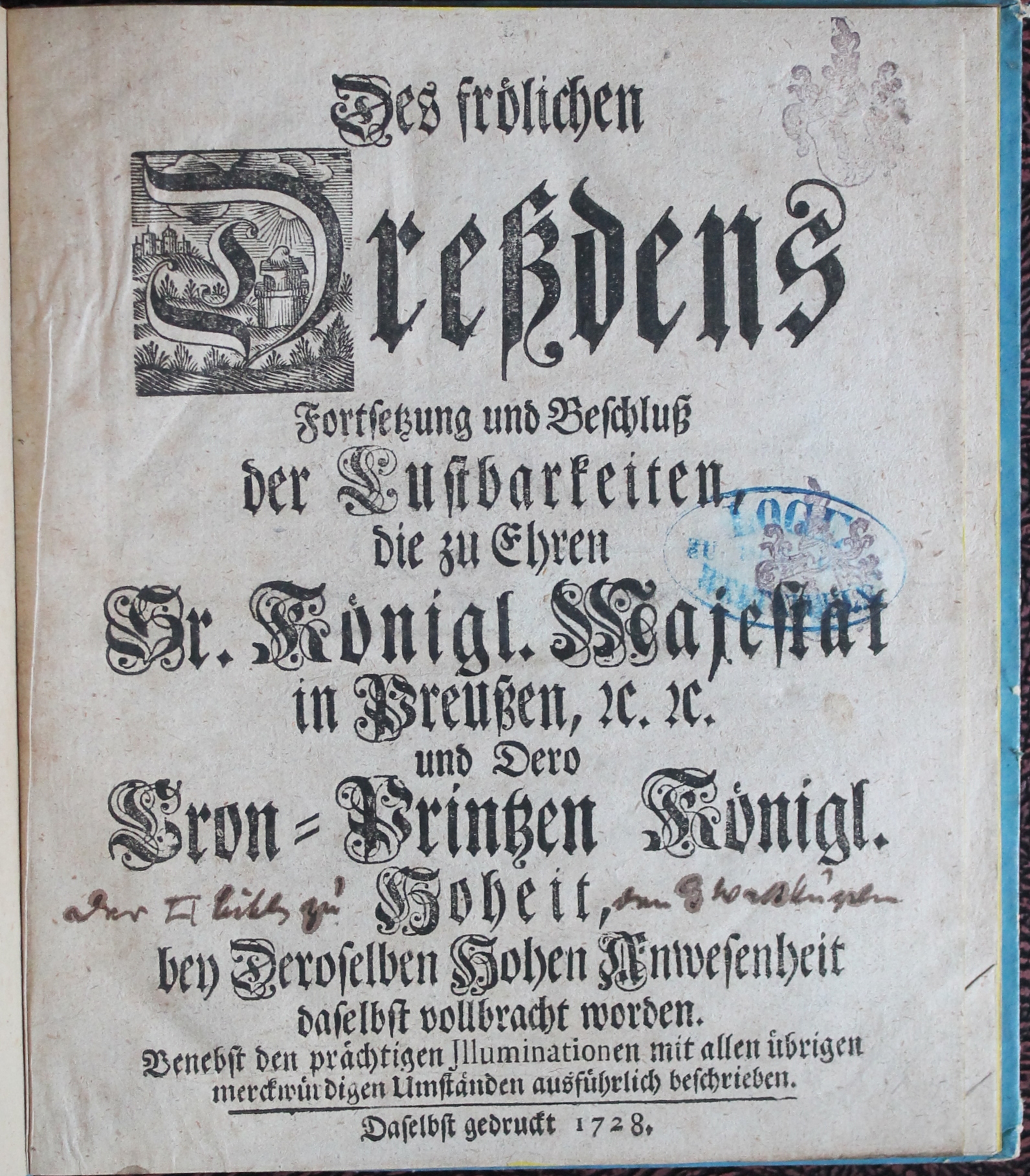 Anonym. Des frölichen Dreßdens Fortsetzung und Beschluß der Lustbarkeiten die zu Ehren Sr. Königl. Majestät in Preußen, u.u. und Dero Cron-Printzen Königl. Hoheit, bey Deroselben Hohen Anwesenheit daselbst vollbracht worden. [...]. Dresden, o.V., 1728. 8°, 40 S., Ppbd. d. Zt.. Einzige Ausgabe. 2. in sich geschlossener Teil des "Tagebuchs" welches den Besuch, im Rahmen des Dresdner Kanevals, des preussichen Soldantenkönigs Friedrich Wilhelm mit seinem nachgereisten Sohn Friedrich II. genauestens beschreibt. Einband berieben bestossen und mit Resten von 2 alten Bibliotheksaufklebern. Papier leicht gebräunt, Titel mit 3 alten alten Logenstempeln und hs. Besitzeintrag. Gutes Exemplar. Bestell-Nr: 8-1-90..........verkauft | ![]() | |