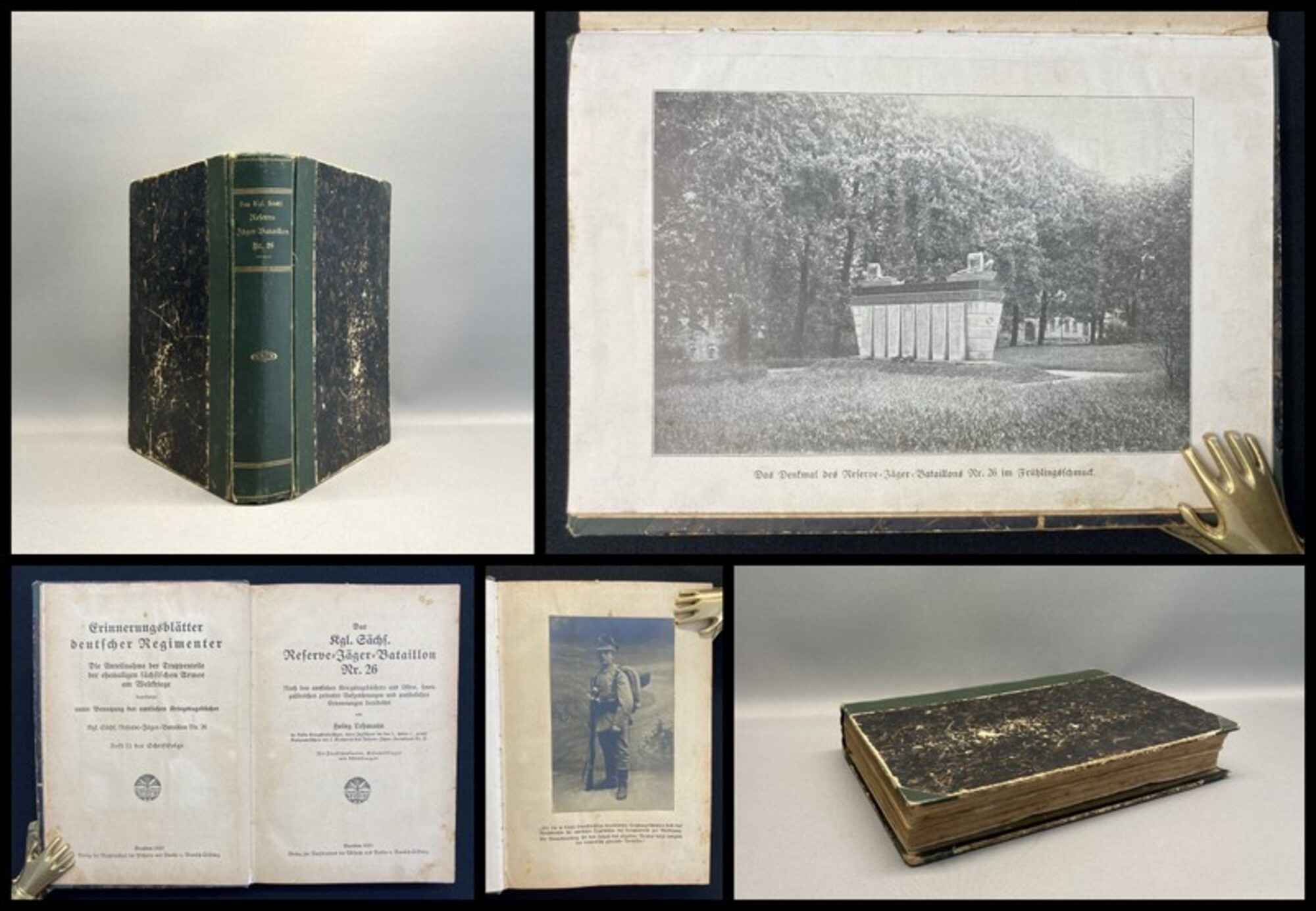 Blohm, Erich / Vogel, Ernst / Saupe, Gottfrid. Das Königl. Sächs. Schützen-Reserve-Regiment "Prinz Georg" Nr. 108. Nach den amtlichen Kriegstagebüchern und anderen Aufzeichnungen bearbeitet. Dresden, 1926, Baensch Stiftung. 8°, mit 1 Übersichtskarte und Gefechtsskizzen und Abb. auf Tafeln, VIII 385 S., 1Bl., OLn. Aus der Reihe: Erinnerungsblätter deutscher Regimenter Sächsische Armee, Heft 31 der Schriftfolge. Einband minimal berieben, Klammerung leicht rostig, papierbedingt etwas gebräunt und vereinzelt leicht fleckig. Bestell-Nr: 8-0-224..........verkauft | ||