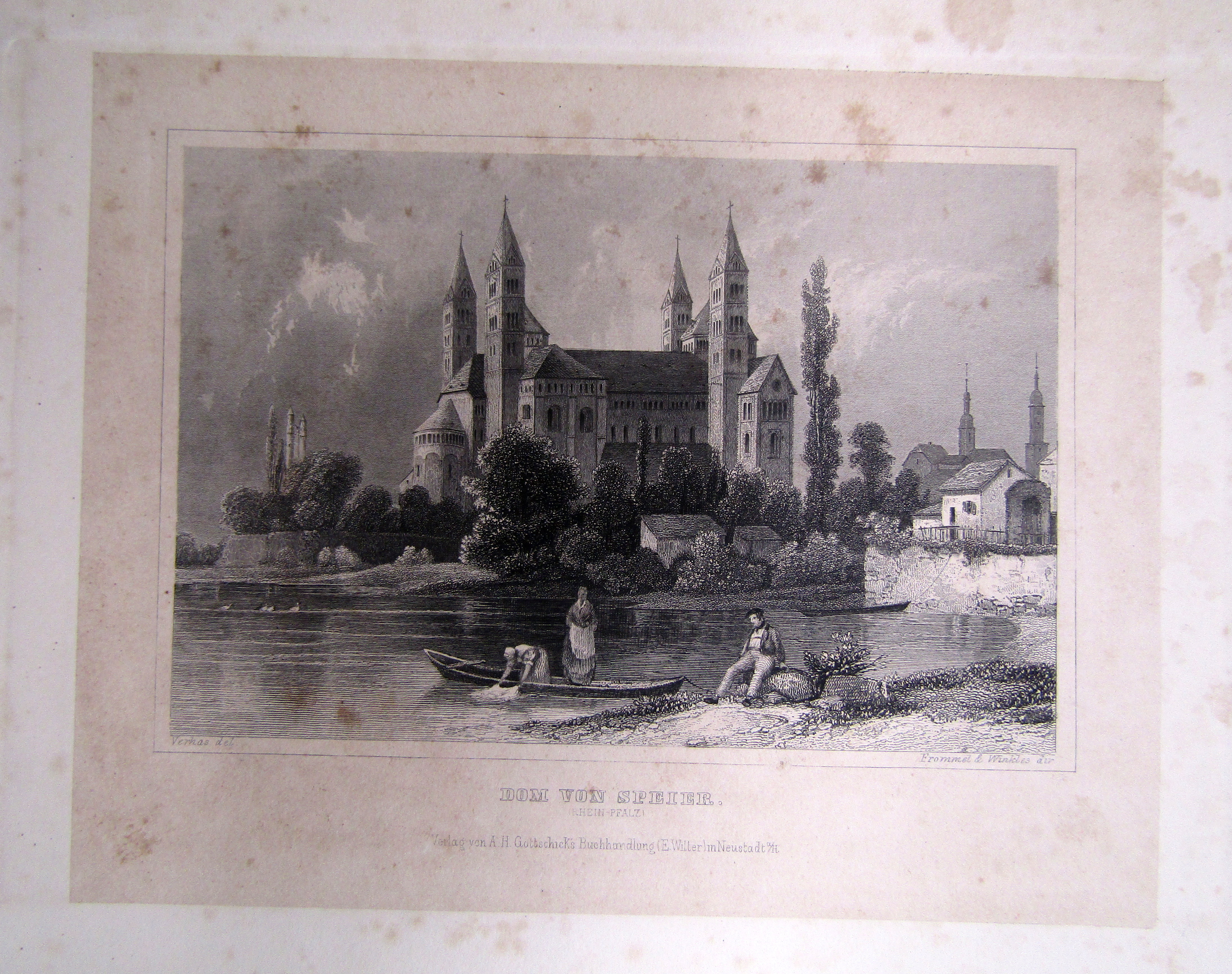 Blaul, Friedrich. Der Kaiserdom zu Speier. Führer und Erinnerungsbuch.. Neustadt a. d. Haardt, A. H. Gottschick, 1860. 4°; mit 14 Stahlstichen, 1 Grundriß des Domes und in den Text gedruckten Holzschnitten; 120 S.; Pbd. Erste Ausgabe des reich illustrierten Speyer-Ansichtenwerks. - Einband berieben und bestoßen. Buchrücken oben und unten mit Fehlstelle. Papierbedingt leicht gebräunt, stellenweise braun-/ fingerfleckig. Gutes Exemplar.. Bestell-Nr: 8-2-371..........150,00 € (inkl. MwSt. zzgl. Versand) | ![]() | |