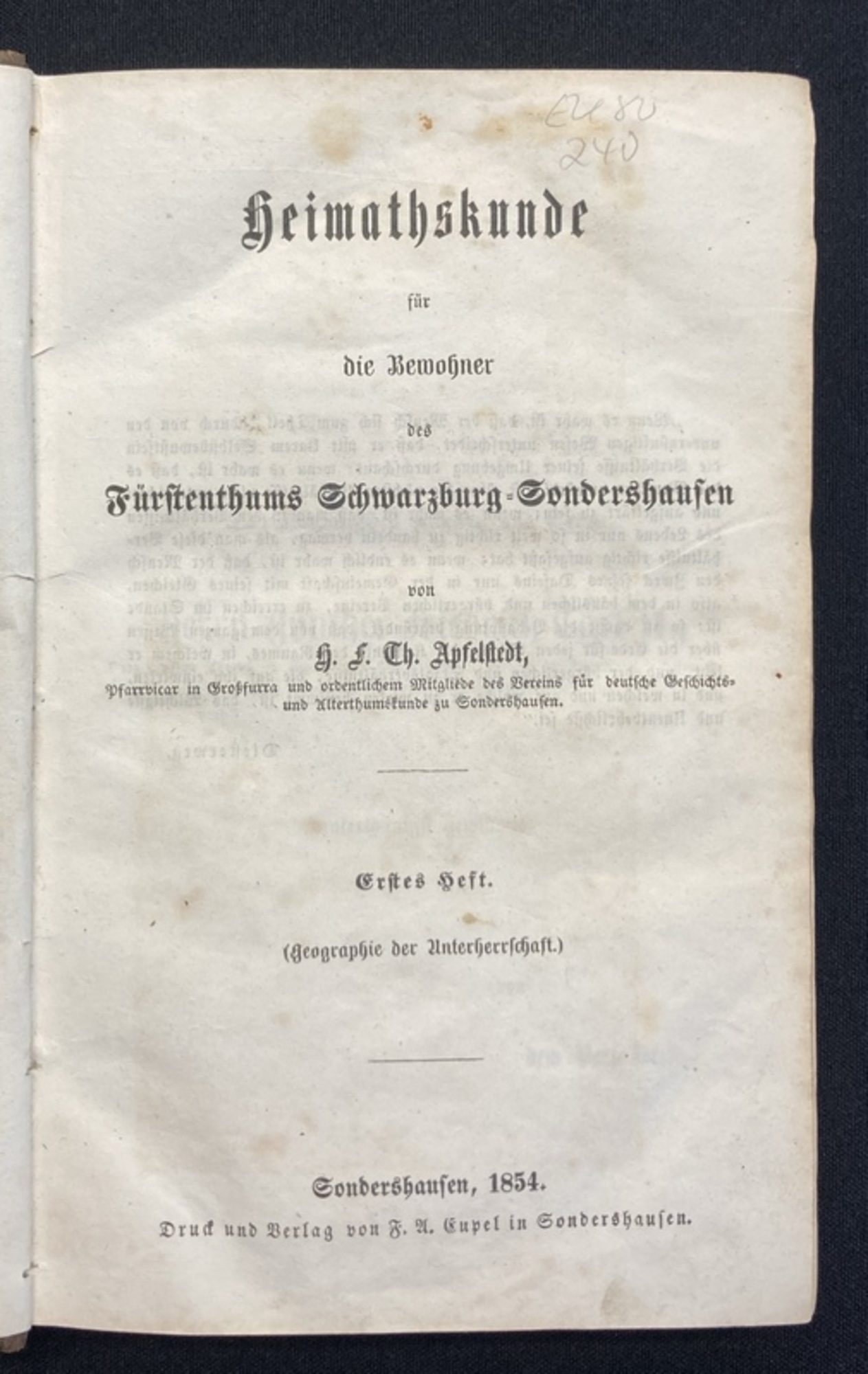 Apfelstedt, H. F. Th.. Heimathskunde für die Bewohner des Fürstenthums Schwarzburg-Sondershausen - Hefte 1-3. Sondershausen, Eupel, 1854. 8°(ca.20x13cm) - Heft 1: 1 Bl., XVI, 215 S., Heft 2: VIII, 235 S., Heft 3: XII, 132 S. ; Halbledereinband. Selten - "Heimathskunde" von Heinrich Friedrich Theodor Apfelstedt ist der Titel eines Buches, das sich mit der Geschichte und Landeskunde des Fürstentums Schwarzburg-Sondershausen befasst. - Einband etwas berieben und bestoßen, mit größerer Fehlstelle auf vorderem Deckel, Rücken etwas geknickt. Papier altersbedingt gering gebräunt, durchgehend leicht braun- und fingerfleckig, einige Seiten etwas stärker. Stellenweise mit kleinen Einrissen an den Rändern. Manche Seiten mit An- und Unterstreichungen in Blei. S.47 mit Eckabriss.. Bestell-Nr: 8-2-609..........220,00 € (inkl. MwSt. zzgl. Versand) | ![]() | |