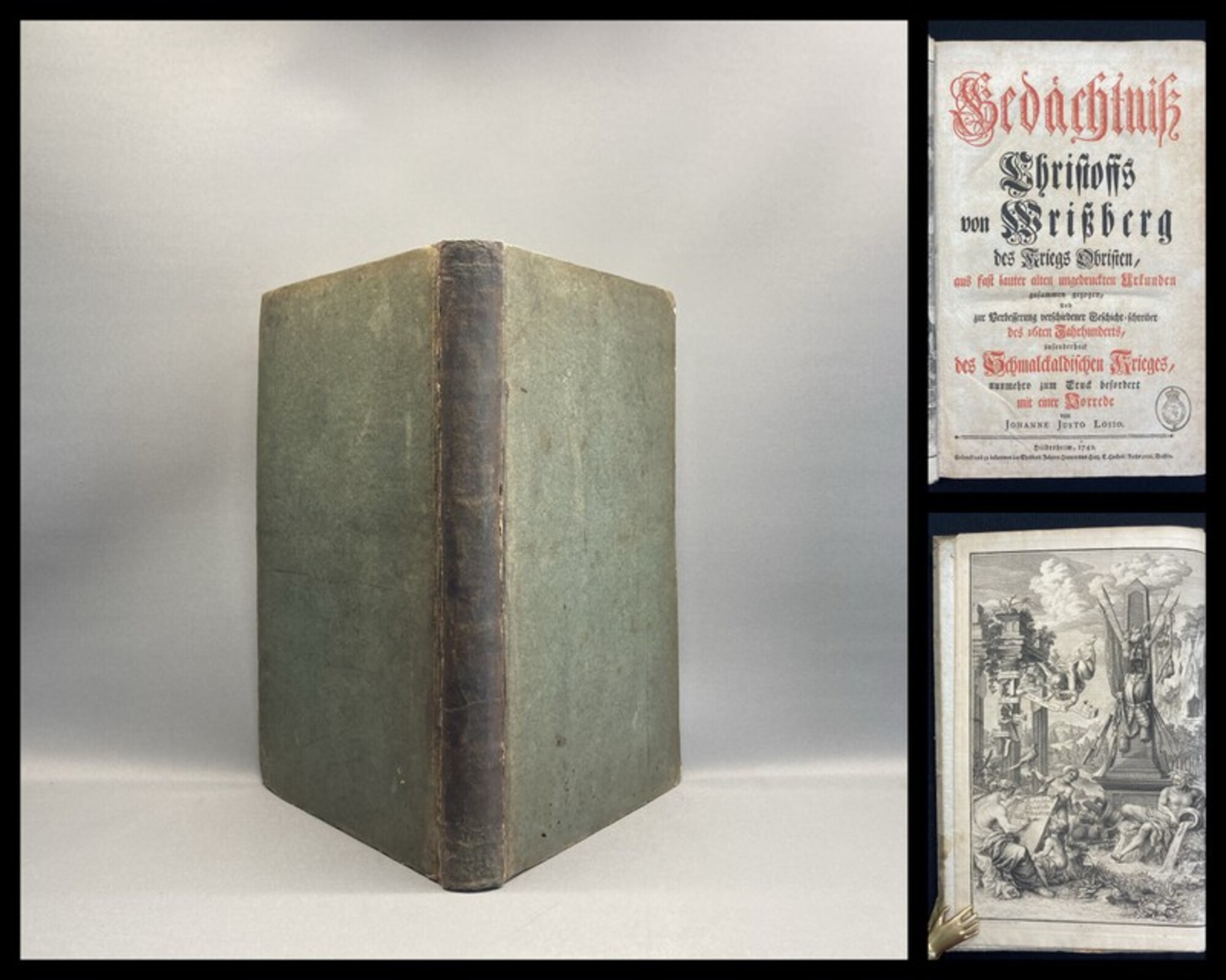 Weislinger, Johann Nicolaus / Hutten, Ulrich von. Huttenus Delarvatus. Das ist: Wahrhaffte Nachricht von dem Authore oder Urheber der verschreiten Epistolarum Obscurorum Virorum Ulrich von Hutten / wobey umständlich und gründlich gehandelt wird von dem Streit zwischen dem berühmten Johanne Reuchlin und Johann Pfefferkorn; wie auch von dem Leben des bekannten Frantzen von Sickingen / und anderen zu der Kirchen-Historie des XVI. Jahrhunderts gehörigen raren Sachen und Merckwürdigkeiten; Aus authentischen Schriften zum nöthigen Schutz der verletzten Wahrheit wider Jacobum Burckhard, einen Lutherischen Professor zu Hildburghausen im Fürstenthum Coburg [...]. Constantz und Augspurg, Martin und Thomas Wagner, 1730. 8°, mit doppelblattgroßem. zweifarbigem Titel, ausfaltbarem Wappenkupfer und 4 Portraitkupfern, 62 S., 519(1) S., Ldr. d. Zt. Schottenloher 9238. Graesse VI/2,433. Seebaß/Edelmann 1984NA - Einzige Ausgabe. Weislinger behandelt in seiner derben polemischen Art zahlreiche humanistische Zeitgenossen des Reuchlin-Pfefferkornstreits, sowie seltene pro- und antisemitische Schriften des 16.-18. Jhts. Die Tafeln mit Portr. von Hutten, Reuchlin, Pfefferkorn u. Sickingen. Die vorliegende, in Augsburg und Konstanz erschienene Schrift, wurde durch die Glaubenskongregation 1732 auf den Index der verbotenen Bücher gesetzt.- Einband berieben und etwas bestoßen, Rücken in den Gelenken mit kl. Wursmspuren, daher unten am Rücken kleine Fehlstelle. Papier altersbedingt etwas gebräunt, vereinzelt etwas braunfleckig. Gutes Exemplar. Bestell-Nr: 8-0-288..........verkauft | ||