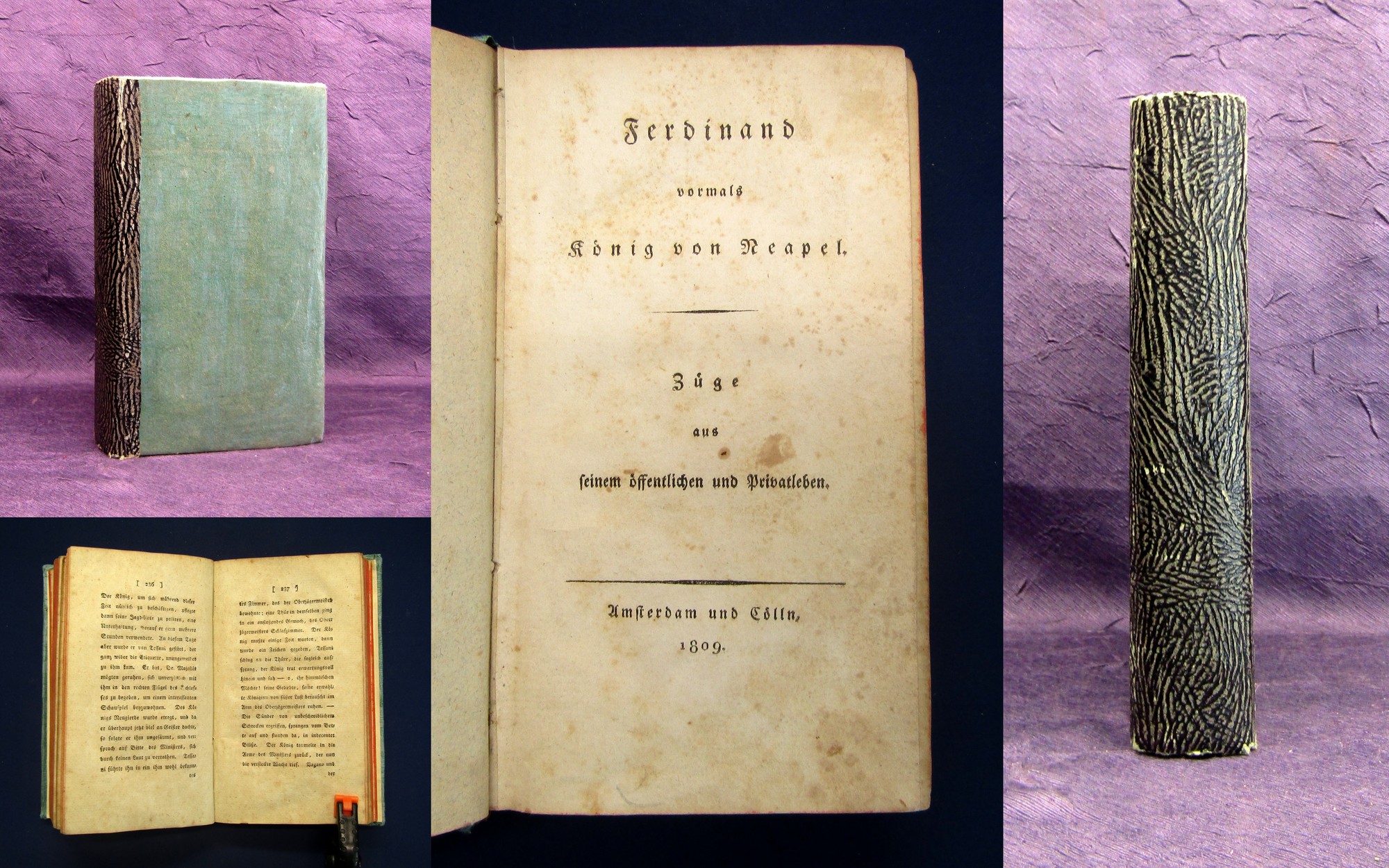 . Ferdinand vormals König von Neapel. Züge aus seinem öffentlichen und Privatleben.. Amsterdam und Cölln, o. V., 1809. kl. 8°; 436 S.; Ppbd. Ferdinando Antonio Pasquale Giovanni Nepomuceno Serafino Gennaro Benedetto von Bourbon (12. Januar 1751 in Neapel; 4.Januar 1825 ebenda) war Infant von Spanien und als Ferdinand IV. König von Neapel (6. Oktober1759-23.Januar 1799; 13.Juni 1799 - 30.März 1806; 22.Mai 1815 - 12.Dezember 1816), als Ferdinand III: König von Sizilien (1759-1815) und als Ferdinand I. König beider Sizilien (1815/16-1825). - Einband berieben und bestoßen. Rücken unsachgemäß erneuert. Papier altersbedingt gerbäunt, stellenweise braun-/ fingerfleckig. Gutes Exemplar.. Bestell-Nr: 8-3-383..........verkauft | ![]() | |