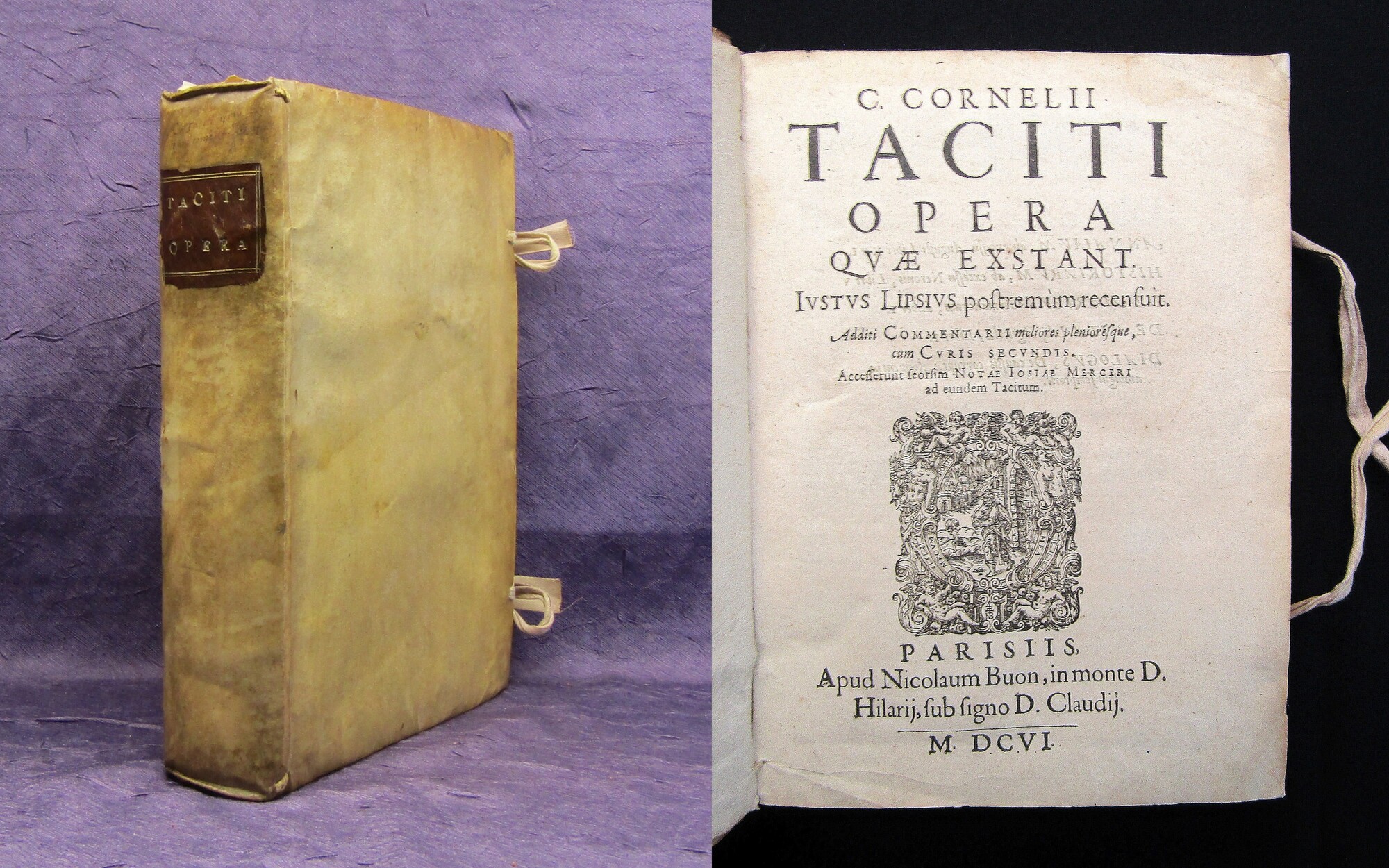 Tacitus, C. Cornelius. C. Cornelii Taciti Opera Quae extant. Justus Lipsius postremum recensuit. Additi Commentaarii meliores plenioresque, cum Curis Secundis. Accesserunt seorsim Notae Iosiae Merciri ad eundem Tacitum [...]. Paris, Nicolaus Buon, 1606. 4° (25x18cm), mit Textholzschnitt, 1(w), 12 nn. Bll., 418 S., 7 nn. Bll. (Index); 246 S.; LXXXII, 12 nn. Bll., 9 S., 1(w), flex. Pgmt. d. Zt. mit RSch. Schöne Pariser Ausgabe mit den bekannten Commentaren und Anhängen. - Einband gebräunt, mit geringen Gebrauchsspuren. Papier etwas gebräunt, wenige Seiten mit papierbedingten kleineren Läsuren. Gutes Exemplar. Bestell-Nr: 8-3-590..........800,00 € (inkl. MwSt. zzgl. Versand) | ![]() | |