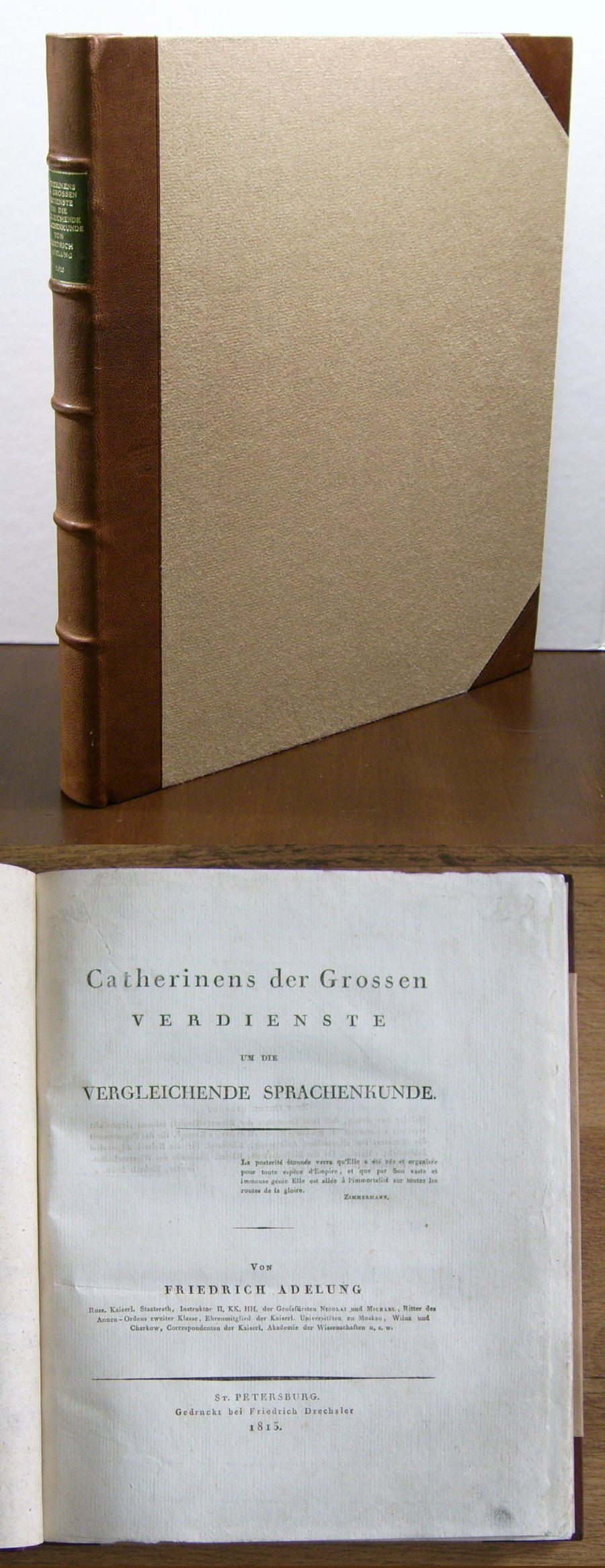 Adelung, Friedrich von. Catherinens der Grossen Verdienste um die vergleichende Sprachenkunde. St. Petersburg, Friedrich Drechsler, 1815. 4°, 4(w) Bll., XIV, 210 S., 1 Bll. (Berichtigungen), 4(w) Bll., neuer Ldr. Erste Ausgabe der seltenen Abhandlung. Adelung (geb. 1768 in Stettin - gest. 1843 in St. Petersburg), deutsch-russischer Jurist und Philosoph, war der Neffe des bekannten deutschen Germanisten Johann Christoph Adelung. Er beschäftigte sich wesentlich mit der Linguistik, woraus eines seiner Hauptwerke, die "Übersicht aller bekannten Sprachen und ihrer Dialekte, St. Petersburg, 1820" hervorging. Sehr gutes Exemplar, gebunden in einem dekorativen, zeitgenössischen Halbledereinband über 5 echten Bünden mit Rückenschild im Schuber, die Originalbroschur beigebunden. Bestell-Nr: 8-0-4..........verkauft | ![]() | |