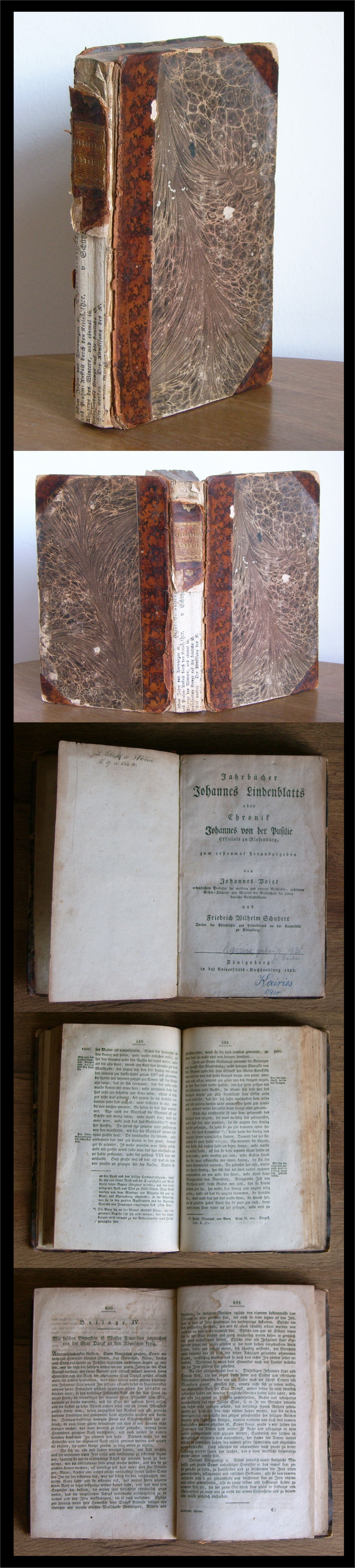 Voigt, Johannes / Schubert, Friedrich Wilhelm. Jahrbücher Johannes Lindenblatts oder Chronik Johannes von Pusilie Officials zu Riesenburg, zum erstemnal herausgegeben [...]. Königsberg, Universitäts-Buchhandlung, 1823. gr. 8°, XXXIV, 407(1) S., HLdr. d. Zt. Erste Ausgabe der Chronik von Preussen nach den alten Handschriften des mittelalterlichen Chronisten Johannes von Pusilie (Johann von der Posilge, geb. um 1340, gest. 14. Juni 1405 (vermutlich)). Einband mit starken Gebrauchsspuren, Buchrücken nur fragmentarisch erhalten. Papier durchgehend gebräunt, teils braunfleckig, zu Beginn und Ende unterschiedlich stark wasserrandig. Vorsatz und Titel mit altem hs. Besitzeinträgen. Im Original sehr seltener Titel. Bestell-Nr: 8-0-30..........verkauft | ![]() | |