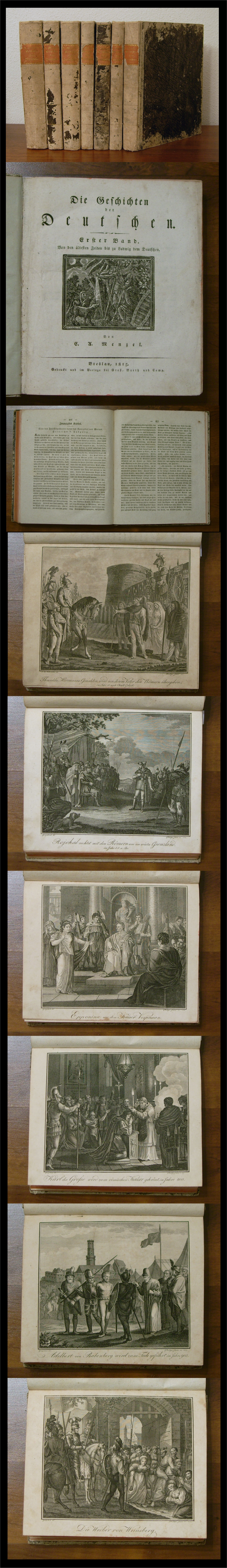 Sporschil, Johann. Die Kaiser-Chronik. Enthaltend die Schlachten, Gefechte, Kämpfe und Waffenthaten der französischen Heere unter Napoleon. Mit neunzig historischen Bildern nach Gemälden der Gallerie zu Versailles und anderer berühmter Meister. In Stahl gestochen von Reveil in Paris.. Leipzig, Weber, 1837. Kl.8°, mit gest. Vortitel, 90 gest. Tafeln, 1 Bl., (VIII) 352 S. Pp d. Z. Erste Auflage. Einband verzogen, bereiben und bestoßen, Titel mit handschr. Namenszug, papierbedingt gebräunt und fleckig. Gesamt noch gutes Exemplar. Bestell-Nr: 8-0-468..........verkauft | ||