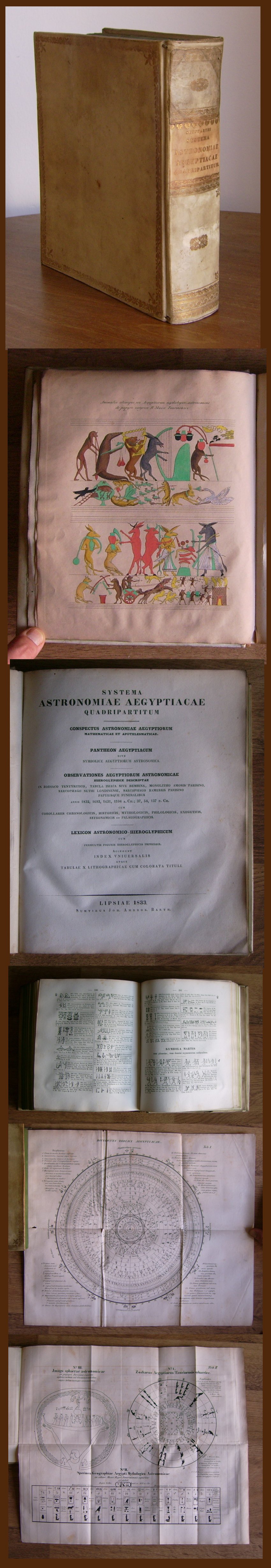 Seyffarth, Gustav. Systema Astronomiae Aegypticae Quadripartitum - Conspectus Astronomiae Aegyptiorum Mathematicae et Apotelesmaticae . Pantheon Aegyptiacum sive Symbolice Aegyptiorum Astronomica. - Observationes Aegyptiorum Astronomicae Hyroglyphice Descriptae [...] - Lexicon Astronomico - Hieroglyphicum [...]. Leipzig, Joh. Ambros. Barth, 1833. 4°, mit 10 gefalt. lithographischen Tafeln und einem kolorirten Titelkupfer, 4 nn. Bll., XXX, 1 nn. Bl., 445 S., Prgt. d. Zt. Erste Ausgabe. Wichtiges und äußerst seltenes Werk des Archäologen Seyffart (1786-1885), erschienen als zweites, drittes, viertes und fünftes Heft seiner "Beiträge zur Kenntniss der Literatur, Kunst, Mythologie und Geschichte des Alten Aegypten." Das Werk unterteilt sich in vier Teile und behandelt u.a.: Kunst, Gesellschaft, Schrift, Sprache, Sternkonstellationen, Traditionen. Der goldverzierte Pergamenteinband etwas berieben und fleckig, vorderer Deckel leicht aufgebogen. Papier im weissen Rand durchgängig etwas braunfleckig teils etwas fingerfleckig. Bestell-Nr: 8-0-22..........verkauft | ![]() | |