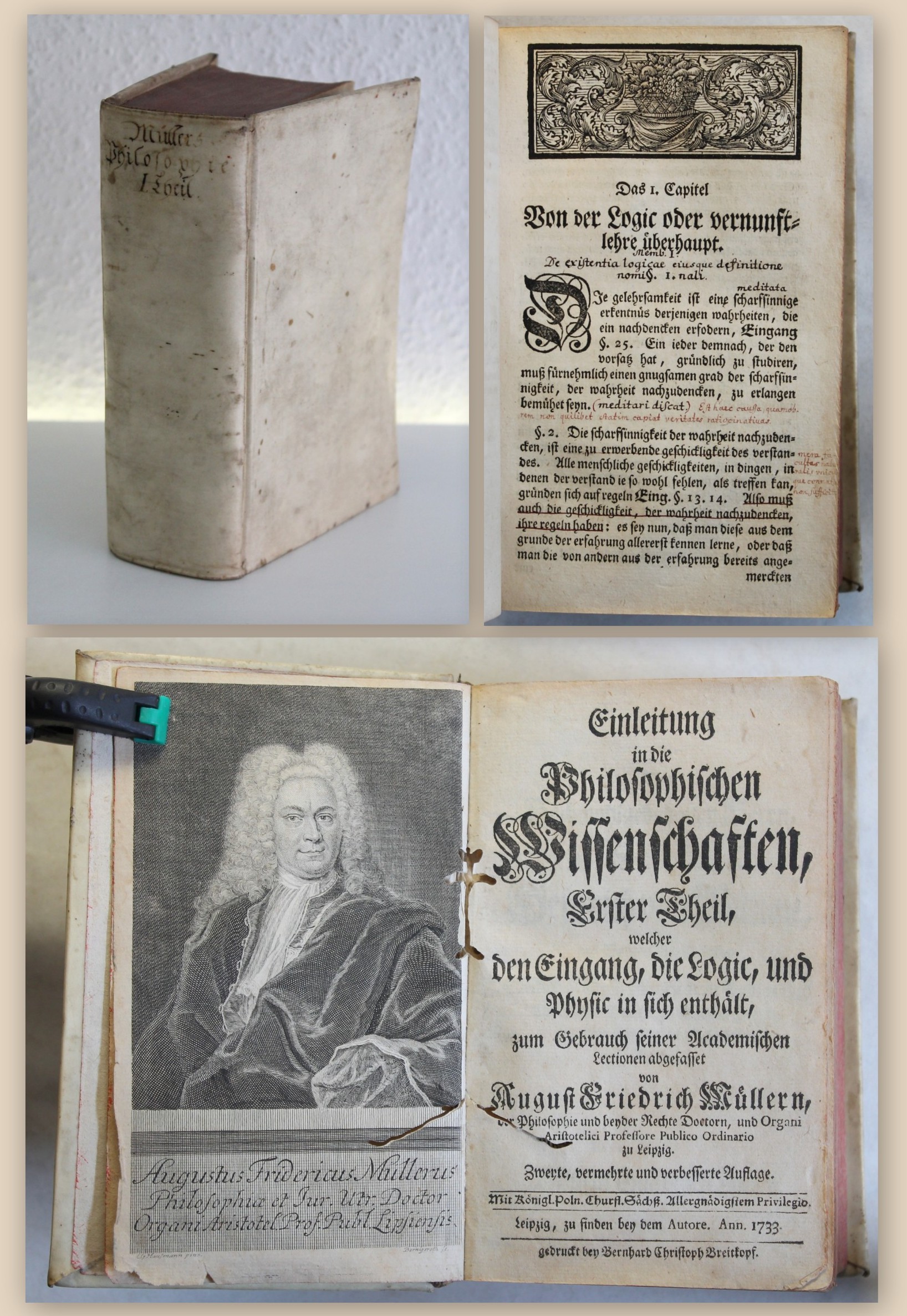 Müller, August Friedrich. Einleitung in die philosophischen Wissenschaften. Theil 1: Welcher den Eingang, die Logic, und Physic in sich enthält, zum Gebrauche seiner Academischen Lectionen abgefasset. Leipzig, Breitkopf, 1733. 8°, mit 1 gestochenen Frontispiz u. Holzschnitt Intialen, 7 Bll., 890 S., 35 Bll., Prgt. d. Zt. Zweite vermehrte und verbesserte Auflage, der sehr seltene Ausgabe, die aufgrund ihrer fehlenden Verfügbarkeit vom Olms Verlag nachgedruckt wurde. Müller (1684-1761) war Jurist und Logiker war Professor in Leipzig. Pergamenteinband minimal Berieben und leicht fleckig. Seiten teils etwas fleckig und leicht gebräunt, Frontispiz und erste Seiten teils wurmspurig, mit sauberen Unterstreichungen von alter Hand. Schöne Ausgabe. Bestell-Nr: 13-0-10..........verkauft | ![]() | |