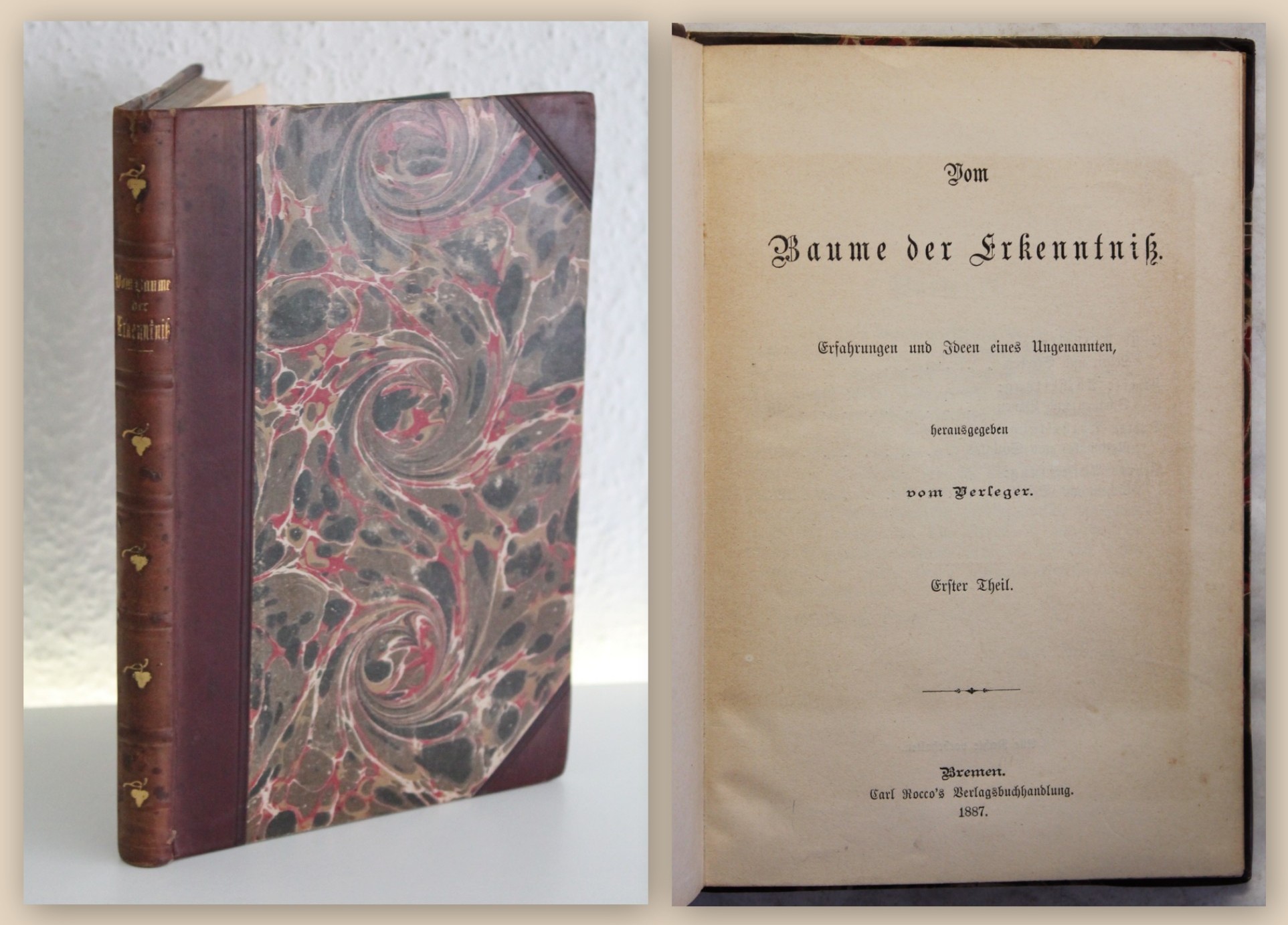 Backhaus, Wilhelm Emanuel. Vom Baume der Erkenntniß. Erfahrungen und Ideen eines Ungenannten, herausgegeben vom Verleger. Erster Theil. Bremen, Carl Rocco, 1887. 8°, 2 nn. Bll., 160 S., HLdr d. Zt. Holzmann / Bohatta VI, 8161 - Erste Ausgabe. Der 1. Teil enthält: Leben und Streben. Schauen und Bauen. Nationales und Sociales. Sein und Schein. Einband etwas berieben und bestossen. Rücken etwas aufgehellt. Titel papierbedingt etwas gebräunt. Sauberes, frisches Exemplar. Bestell-Nr: 13-0-11..........verkauft | ![]() | |