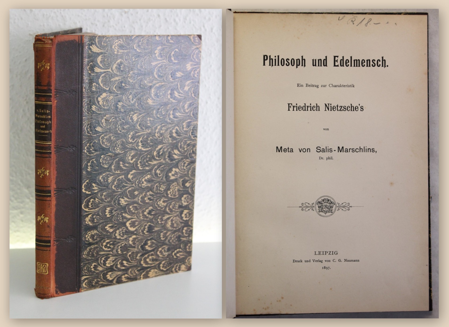 Salis-Marschlins, Dr. phil. Meta von [d.i. Barbara Margaretha]. Philosoph und Edelmensch. Ein Beitrag zur Charakteristik Friedrich Nietzsche´s. Leipzig, C. G. Naumann, 1897. 8°, 2 Bll., 110 S., 1 Bl., OHLdr. Erste Ausgabe. Einband berieben, kaum bestossen. Kapitale ausgefranst. Papier sauber, durchgehend mit zarten hs. Anstreichungen und Notizen in Blei. Gutes Exemplar . Bestell-Nr: 13-0-14..........verkauft | ![]() | |