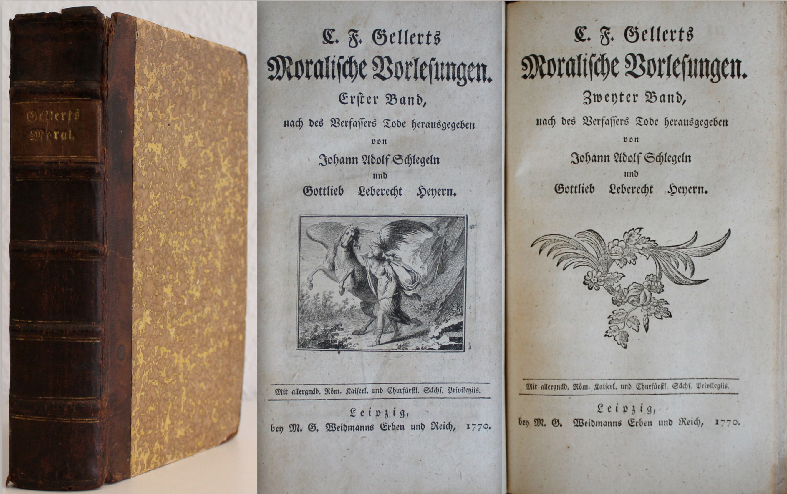 Schlegel, Johann Adolf / Heyer, Gottlieb Leberecht / Gellert C. F. Gellert´s Moralische Vorlesungen. Erster Band, [und Zweyter Band] nach des Verfassers Tode herausgegeben [...]. Leipzig, M. G. Weidmanns Erben und Reich, 1770. 8°, mit einer gest. Titelvignette, XXXVIII, S. 1-358 S.; 2 Bll., S. 359-650, HLdr. d. Zt. mit RS. Goed. IV/1, 78, 21 - Erste Ausgabe dieser Sammlung. Einband etwas berieben, kaum bestossen, oberes Kapital etwas abgegriffen. Papier sauber, Vorsatz mit altem hs. Besitzeintrag, vorderer Spiegel mit altem kleinem Antiquariatsaufkleber, wenige Seiten im untersten Rand mit bräunflichem Fleck. Gutes Exemplar. Bestell-Nr: 13-0-17..........verkauft | ![]() | |