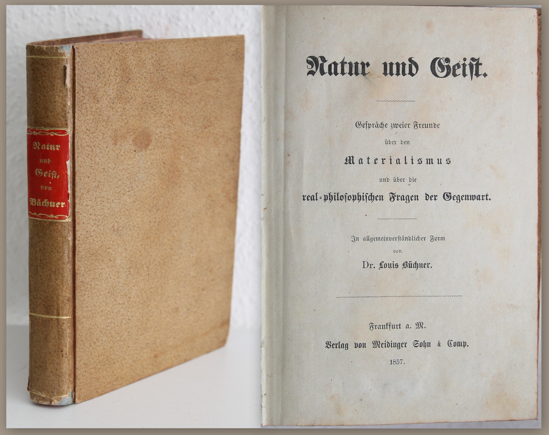 Büchner, Dr. Louis. Natur und Geist. Gespräche zweier Freunde über den Materialismus und über die real-philosophischen Fragen der Gegenwart. Frankfurt a. M., Weidinger Sohn & Comp, 1857. kl. 8°, XIV, 300 S., 5 nn. Bll., Pbd. Einband kaum berieben und bestoßen. Vorderer Vorsatz mit kleinem, handschriftlichen Besitzvermerk. Papierbedingt leicht gebräunt und stellenweise braunflckig. Gutes Exemplar. Bestell-Nr: 13-0-19..........verkauft | ![]() | |