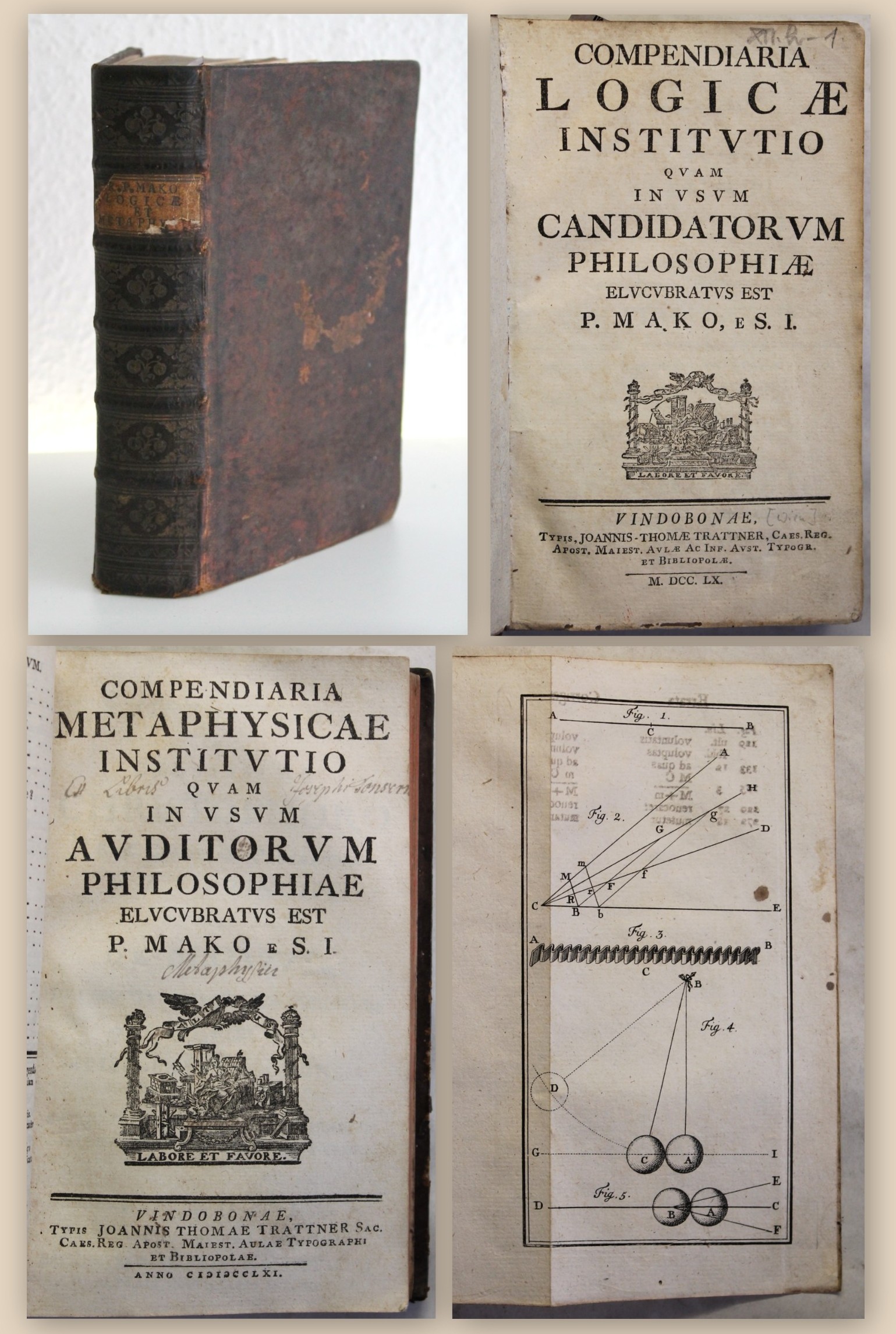 Kerek-Gede, Paul Mako von. Compendiaria Logicae Institutio quam in usum Candidatorum Philosophiae [...], angeb. ders.: Compendiaria Methaphysicae Institution quam in usum Auditorum Philosophiae [...]. Vindobonae (Wien), Johann Thomas Trattner, 1760/61. 8°, mit einer Tafel in Titel 2, 5 Bll., 3-131(1), 2 Bll.; 10 Bll., 397(1) S., 1 Bl., Ldr. d. Zt. Einband berieben und etwas bestoßen. Papier altersbedingt etwas gebräunt, vereinzelt etwas braunfleckig. Titel 2 mit zarten hs. Eintrag. Spiegel und Vorsätze mit Einträgen von alter Hand. S. 17/18 oben mit kl. Einriss, S. 20/21 mit kl. Abriß im weißen Rand. Gutes Exemplar. Bestell-Nr: 13-0-25..........400,00 € (inkl. MwSt. zzgl. Versand) | ![]() | |