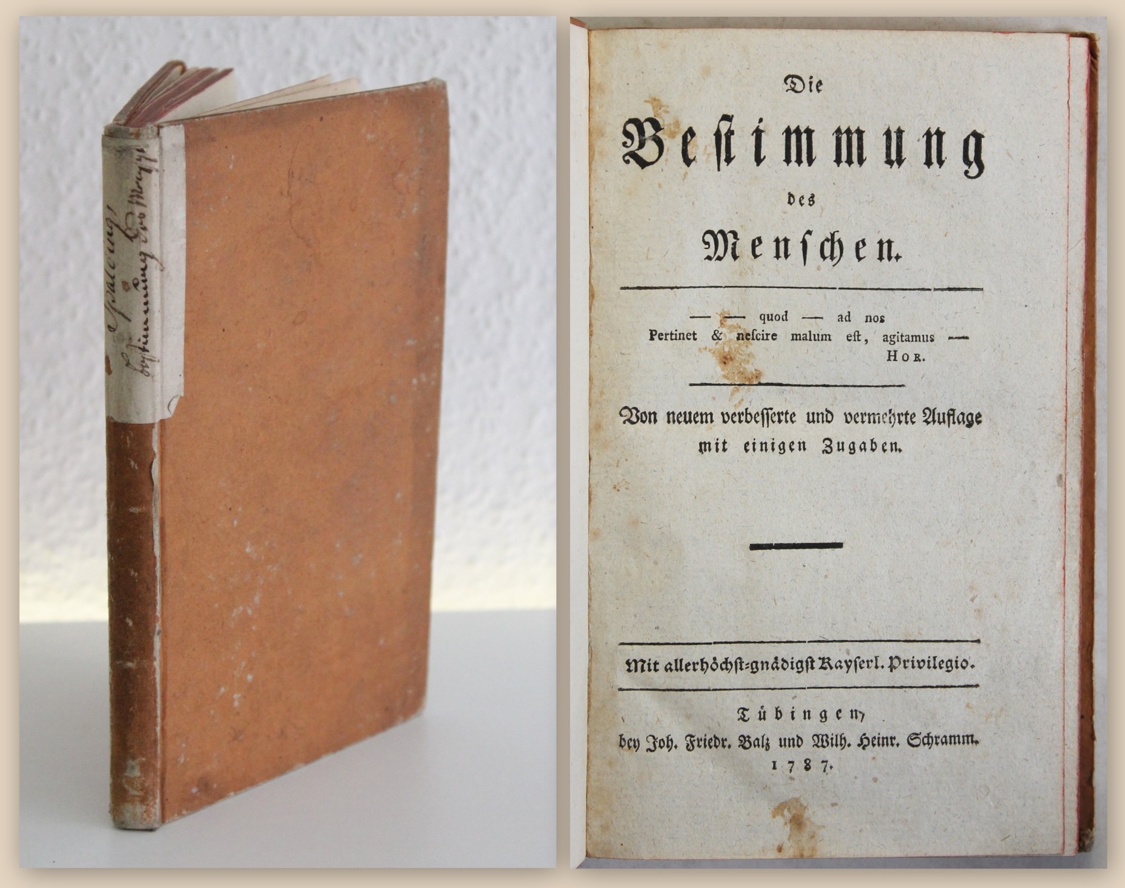 Anonym [Spalding, Johann Joachim]. Die Bestimmung des Menschen [...] Von neuem verbesserte und vermehrte Auflage mit einigen Zugaben. Tübingen, Joh. Friedr. Balz / Wilh. Heinr. Schramm, 1787. 8°, 4 Bll., S. 11- 110, Ppbd. d. Zt. Einband etwas berieben, kaum bestossen, Rücken mit hs. Rückenschild. Die Seitenzählung beginnt mit S. 11, direkt nach der Widmung des Verfassers. Titel etwas fleckig. Bestell-Nr: 13-0-26..........verkauft | ![]() | |
