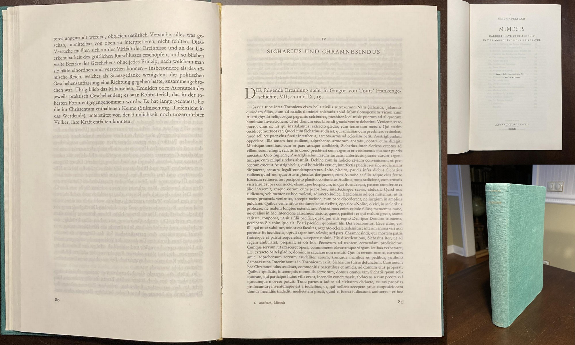 Auerbach, Erich. Mimesis. Dargestellte Wirklichkeit in der Abendländischen Literatur. Bern, A. Francke AG, 1946. gr. 8°, 503(1) S., OLn. Erste Ausgabe von Auerbachs Hauptwerk. - Erich Auerbach (1892-1957) wurde als bedeutender Romanist und Kulturphilosoph anerkannt. 1936 emmigrierte Auerbach mit seiner Familie unter dem politischen Druck der Judenverfolgung in die Türkei, wo er an der Universität in Istanbul lehrte. 1947 emmigrierte Auerbach in die USA, wo er auch zeitlebens verblieb. Auerbach gehörte mit Karl Vossler, Leo Spitzer, Ernst Robert Curtius zu den bedeutendsten Vertretern seines Faches. Sein im türkischen Exil zwischen 1942 und 1945 entstandenes Hauptwerk Mimesis zählt bis heute zu den grundlegenden Werken der deutschen Romanistik mit einer großen Wirkungsgeschichte. uerbach gehörte mit Karl Vossler, Leo Spitzer, Ernst Robert Curtius zu den bedeutendsten Vertretern seines Faches. - Einband mit minimalsten Gebrauchsspuren. Papier sauber und frisch. Obere Ecken etwas gestaucht, dadurch durchgehend leichte Knickspur im Papier. Gutes Exemplar. Bestell-Nr: 13-0-34..........350,00 € (inkl. MwSt. zzgl. Versand) | ![]() | |