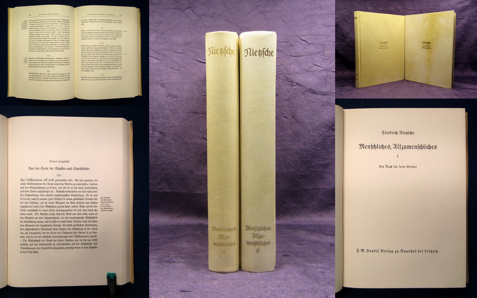 Nietzsche, Friedrich. Menschliches, Allzumenschliches. Ein Buch für freie Geister. 2 Bde. Naunhof bei Leupzig, F.W. Hendel, 1940. gr. 8°, 400 S, 2 Bll.; 368 S., 2 Blll., Ganzpergamenteinbände. Liebhaberausgabe. Ex. 268 und 289 von je 1425 der GA. Saubere, gut erhaltene, nahezu verlagsfrische Exemplare. Bestell-Nr: 13-0-35..........verkauft | ![]() | |