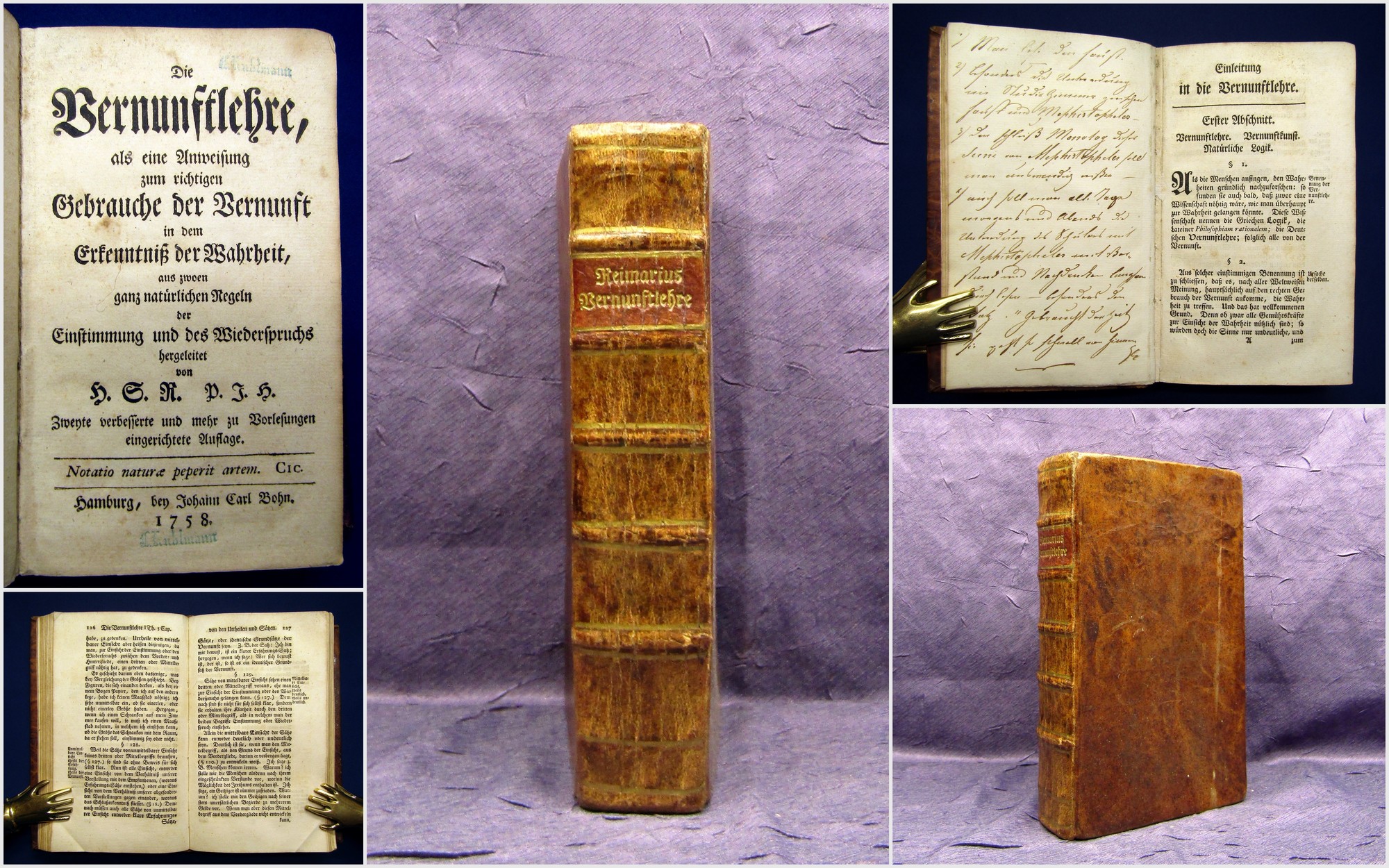 Reimarus, Hermann Samuel. Die Vernunftlehre, als eine Anweisung zum richtigen Gebrauche der Vernunft in dem Erkenntniß der Wahrheit [...] 2. verbesserte Auflage. Hamburg, Johann Carl Bohn, 1758. 8° (18x11cm), Titel, 8(w) Bll., 419(1) S., 12 Bll.(Register), 3 ausfaltbare Tafeln, Ldr. d. Zt. Bekanntes philosophisches Werk von Reimarus (1694-1768), der in Hamburg als Professor am akadem. Gymnasium tätig war. - Einband mit geringen Gebrauchsspuren, Papier etwas gebräunt, sehr vereinzelt minimal braunfleckig. Vorsatz mit hs. Namenszug, Titel, mit 2 zarten Namensstempeln. 1 weisses Bl. mit alten Notizen. Gutes Ex. - (liegt in Dresden). Bestell-Nr: 13-0-36..........450,00 € (inkl. MwSt. zzgl. Versand) | ![]() | |