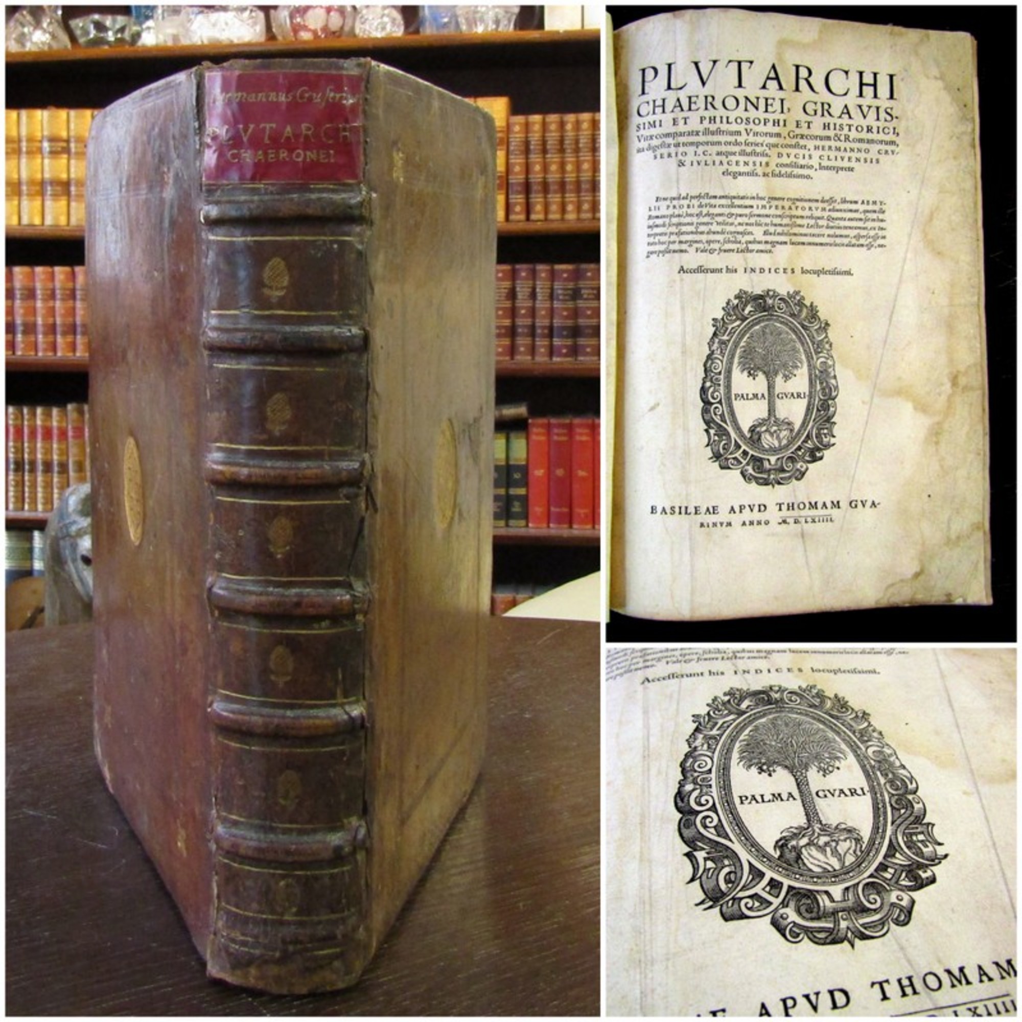 Plutarchus. Plutarchi Chaeronei Gravissimi et Philosophi et Historici . Basel, Guarinus, 1564. 2° (33x25cm), Ledereinband, Bünde u.Rs, 6Bl, 785 S., 35 Bl. Enthält 2 Werke; 1. enth. Werk: Nepos, Cornelius: Liber de vita excellentium imperatorium, 2. ent. Wer: Nepos, Cornelius: M. Porcii Catonis vita, Plutarchs Lebensbeschreibungen sind ein Werk großer Gelehrsamkeit und Forschungsarbeit ; Plutarch (um 46 n.Chr.-120) gibt sorgfältig alle seine Quellen an, und ihre Zahl allein bezeugt seine gewaltige Belesenheit - Ledereinband berieben, bestoßen und fleckig,Fehlstellen an Übergang von Bünden zu Falz, Papier wasserfl., Titel knickspurig u. an Ecken rest., Schnitt stellenw. knickspurig, Papier altersbed. gebräunt . Bestell-Nr: 13-0-38..........verkauft | ![]() | |