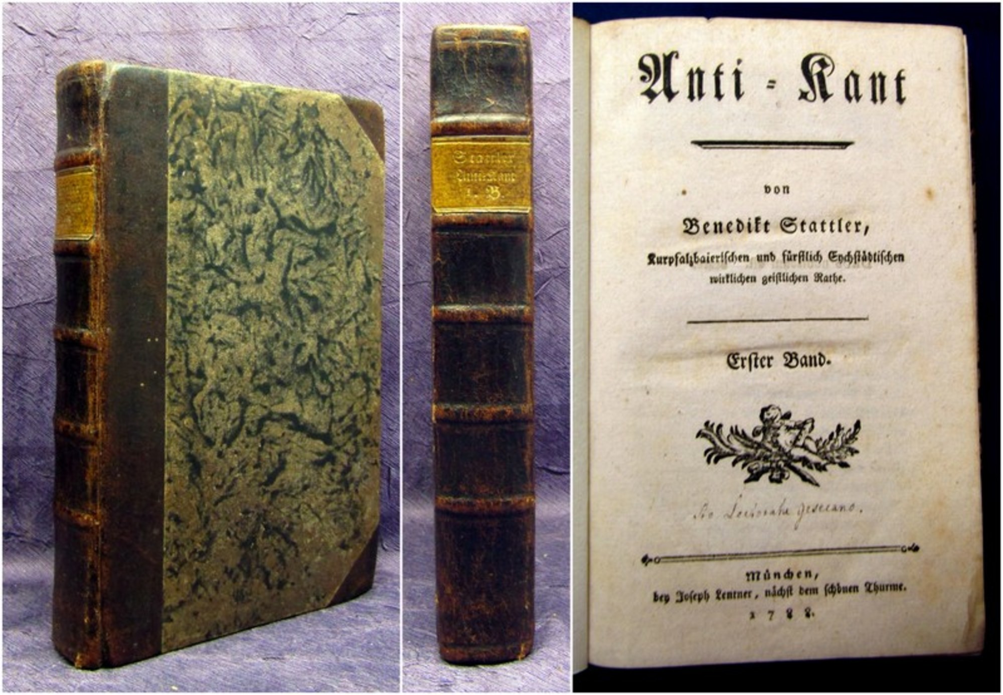 Stattler, Benedikt. Anti-Kant. 2 Bde (ohne den Anhang). München, Joseph Lentner, 1788. 8° (19x12cm), 16 Bll., 482 S., 1 Bl.; 8 Bll., 429 S., 1 Bl., HLdr. d. Zt. mit RS. Ziegenfuß/Jung II, 622; Adickes 625; Ueberweg III, 720 - Erste Ausgabe, selten. Stattlers Hauptwerk gegen Kant, einer der schärfsten katholischen Angriffe. 1789 erschien noch ein Anhang mit einer Widerlegung von Kants Metaphysik der Sitten. - Einbände gering berieben, kaum bestoßen. Papier etwas gebräunt, sehr vereinzelt gering braunfleckig. Bd. II zu Beginn mit kleinem Feuchterand in unterer Ecke. Auf S. 7/8 in Bd. 1 kleiner Tintenfleck. Insgesamt wohl erhaltene Exemplare. Bestell-Nr: 13-0-40..........verkauft | ![]() | |