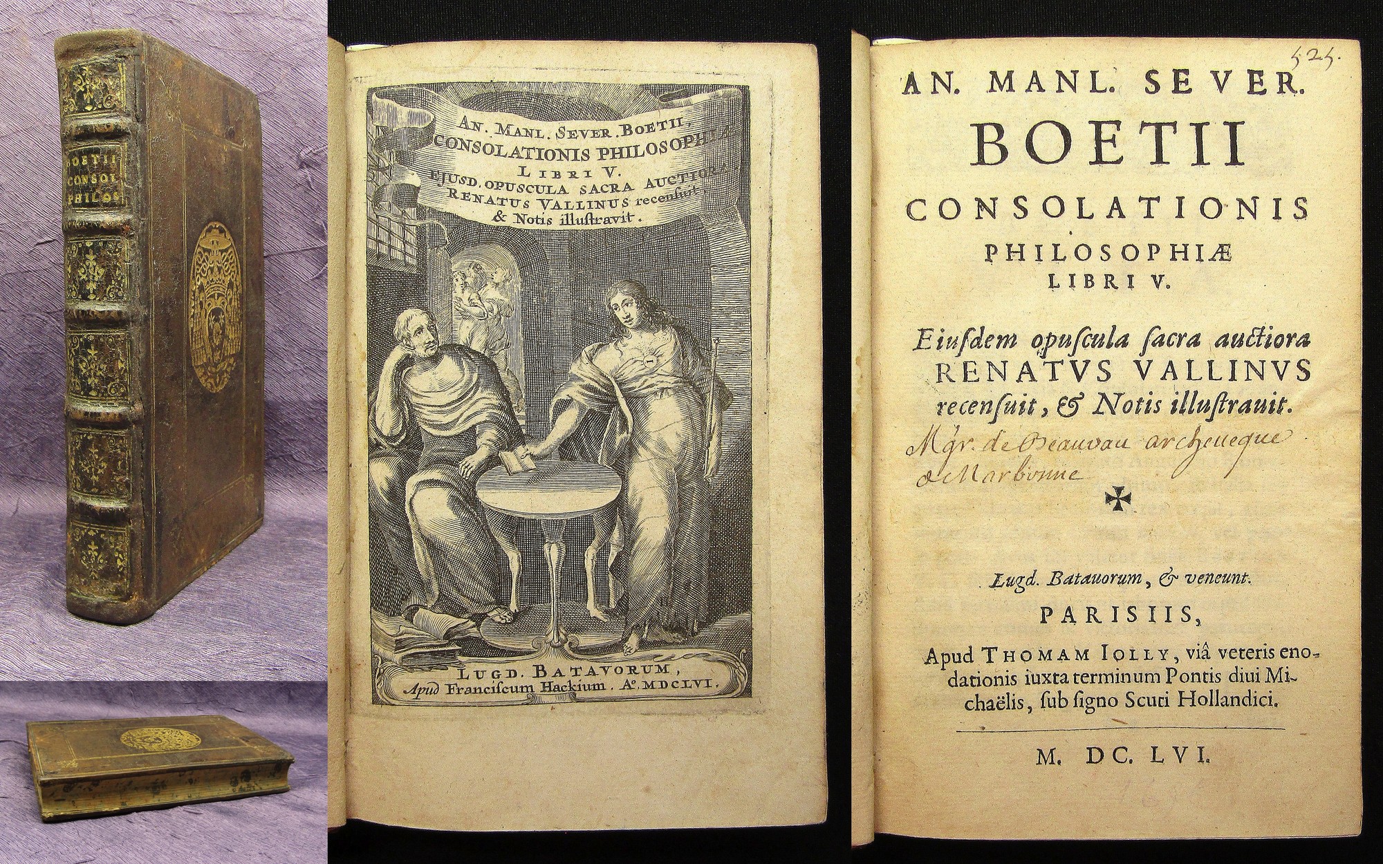 Boethius. Boetii Consolationis Philosophiae - Libri V . Leiden, Franciscum Hackium, 1656. kl 8°(16x11cm), gestochener Titel, 15 Bll., 214 S.,7 Bll., 117 S., 5 nn. S., Ledereinband mit Bischofswappen Supralibri auf vorderem Deckel. Jöcher IV 1433 - Das Exemplar enthält 5 Werke: Consolationis Philosophiae, Opuscula Sacra, In cipit Liber, Incipit Ejusdem ad Eundem, Consolationis Philosophiae et Opuscula Sacra - Einband berieben und bestoßen, Rücken mit üppiger, floraler Goldverzierung, hs. Vermerke auf Spiegelund Vostazblättern, Papier altersbedingt gebräunt. Bestell-Nr: 13-0-45..........verkauft | ![]() | |