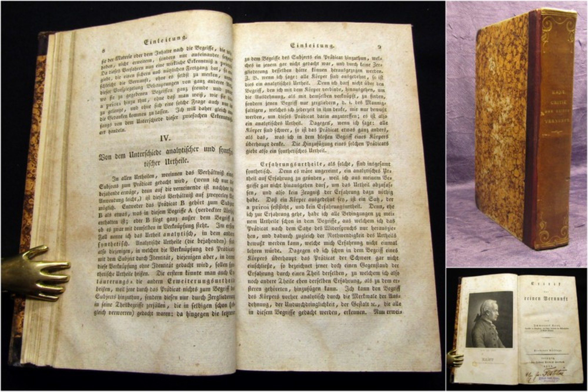 Kant, Immanuel. Critik der reinen Vernunft. Riga, Johann Friedrich Hartknoch, 1781. gr. 8° (20,2 x 11,9 cm), 12 Bll. (1 Bl. Titel, 2 Bll. Widmung, 8 Bll. Vorrede, 1 Bl. Inhalt), 856 SS. (S. 426-461 nicht paginiert). HLdr. d. Zt. auf 5 Bünden mit farbigem Rs. Der Rücken mit 5 goldgepr. Fleurons und den Bünden folgenden Goldfileten. Warda 59. Carter/Muir 226. Goed. V, 3, 6. VD18 14482940 - Erste Ausgabe eines der Hauptwerke der philosophischen Weltliteratur. Ausgangspunkt ist das Drama der metaphysischen Erkenntnis, das Kant in den Grenzen der menschlichen Vernunft begründet sieht, die nicht imstande sei, hinter die sichtbare Wirklichkeit zurückzugehen. In seinem Hauptwerk vollzieht Kant schließlich eine Wende in der Erkenntnistheorie: Nicht mehr die Gegenstände der Welt, sondern der Verstand selbst ist das Maß der Erkenntnis. Ziel des Werks sei eine Kritik „des Vernunftvermögens überhaupt, in Ansehung aller Erkenntnisse, zu denen sie, unabhängig von aller Erfahrung, streben mag“ (Vorwort). - Nur diese Ausgabe enthält den ursprünglichen Text. Nach einer sehr verhaltenen Rezeption des Werkes folgte im Jahr 1787 eine in Teilen stark umgearbeitete zweite Auflage, die für die späteren Ausgaben als Grundlage diente. Schopenhauer urteilte über die umgearbeitete Fassung: „Aber Keiner bilde sich ein, die ‚Kritik der reinen Vernunft‘ zu kennen und einen deutlichen Begriff von Kants Lehre zu haben, wenn er jene nur in der zweiten, oder einer der folgenden Auflagen gelesen hat; das ist schlechterdings unmöglich: denn er hat nur einen verstümmelten, verdorbenen, gewissermaaßen unächten Text gelesen. Es ist meine Pflicht, Dies hier entschieden und zu Jedermanns Warnung auszusprechen“. - Aus der Bibliothek des deutschen Diplomaten und Botschafters in Moskau, Rudolf Nadolny (1873-1953), dessen Stempel auf der Rückseite des fliegenden Vorsatzes zu finden ist. Im Jahr 1934, in der Frühphase der nationalsozialistischen Herrschaft, war Nadolny neben Friedrich von Prittwitz und Gaffron der einzige deutsche Spitzendiplomat, der aus politischer Opposition heraus sein Amt niederlegte. - Einband berieben und gering bestoßen. Ecken aufgeplatzt. Schabspuren auf beiden Deckeln. Vorderes Rückengelenk etwas angerissen. Rückenbezug am Schwanz eingerissen, Kopf mit kleiner Bezugsfehlstelle. Rückenvergoldung berieben. Vor- und Nachsatz, Titel, Widmung und letzte 3 Bll. in den Ecken schwach leimschattig. Titel zudem minimal alters- bzw. braunfleckig. Einige Blätter unaufgeschnitten, wenige in der unteren rechten Ecke leicht gestaucht. Insgesamt sehr gutes und sauberes Exemplar mit minimalen Altersspuren und ohne Marginalien oder An- und Unterstreichungen . Bestell-Nr: 13-0-75..........verkauft | ||