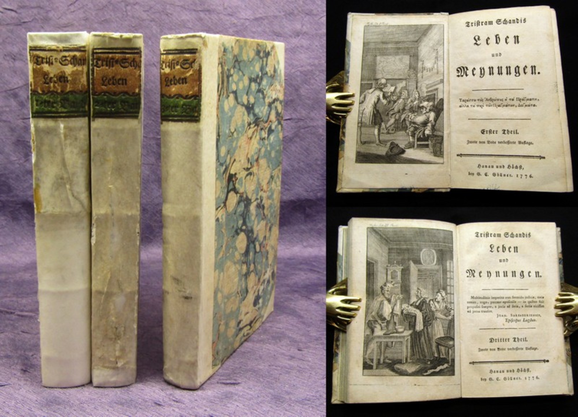 Sterne, Laurence. Tristram Schandis Leben und Meynungen - 9 Teile in 3 Bde.. Hanau, Göllner, 1776. kl 8°(17x10,5cm), 1 Kupferstich, XII., 2 Bll., 305 S., 294 S., 230 S., 1 Bl., Pappeinbände. Ebert II 21755 - Zweite, verbesserte Auflage welche von größter Seltenheit ist.. Entgegen der Ankünigung des Titels, der eine fiktive Autobiografie erwarten lässt, erfährt der Leser nur wenig über das leben des Titelhelden und Ich-Erzählers Tristram... - Einbände berieben und bestoßen/Rücken stärker bzw. restauriert (Bd. 1), Papier altersbedingt gebräunt und stellenw. fleckig. Bestell-Nr: 13-0-52..........Preis auf Anfrage | ![]() | |