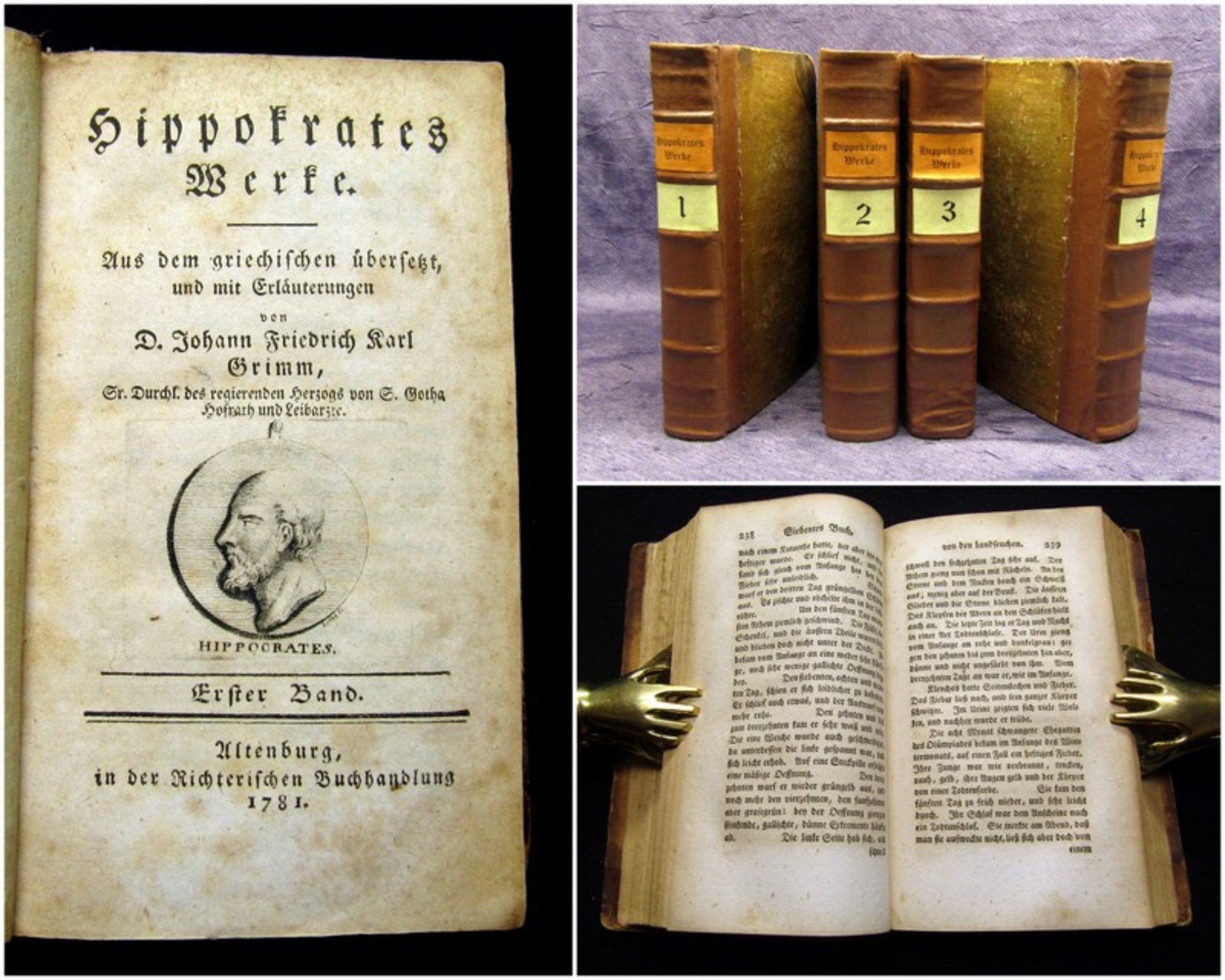 Hippokrates. Hippokrates Werke - 4 Bde.. Altenburg, Richter, 1781-1792. kl 8°(17x11cm), Exlibri auf Titel, 4 Bll., 584 S., 18 Bll., XVIII., 1 Bl., 504 S., 3 Bll., 618 S., 3 Bll., 634 S., moderne Halbledereinbände unter Verwendung der Original-Pappdeckel. ADB IX, 689 - Erste deutsche Ausgabe der Werke des Hippokrates, übersetzt von dem Mediziner Johann Friedrich Karl Grimm. - Einbände berieben und bestoßen, Rücken und Rückenschilder erneuert, Papier durchgängig gebräunt und braunfleckig. Bestell-Nr: 13-0-53..........verkauft | ![]() | |