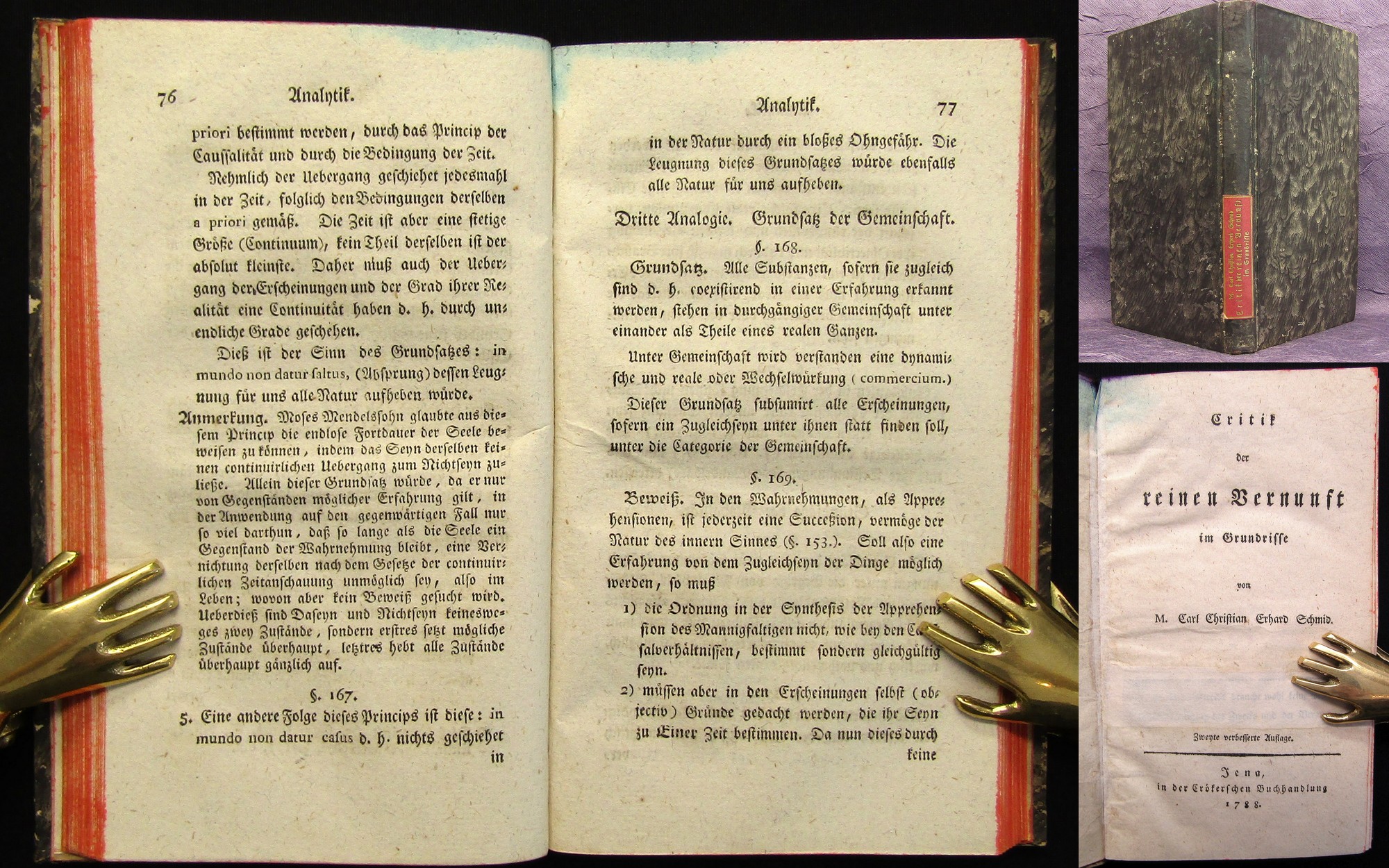 Schmid, M. Carl Christian Erhard. Kritik der reinen Vernunft im Grundbegriffe. Jena, Crökersche Buchhandlung, 1788. 8°(18,5x11cm), 3 Bll., 202 S., Pappeinband. Einband berieben und bestoßen, roter Rundumschnitt, Titel beschnitten, Seiten durchgängig farbfleckig, Papier altersbedingt gebräunt. Bestell-Nr: 13-0-54..........verkauft | ![]() | |