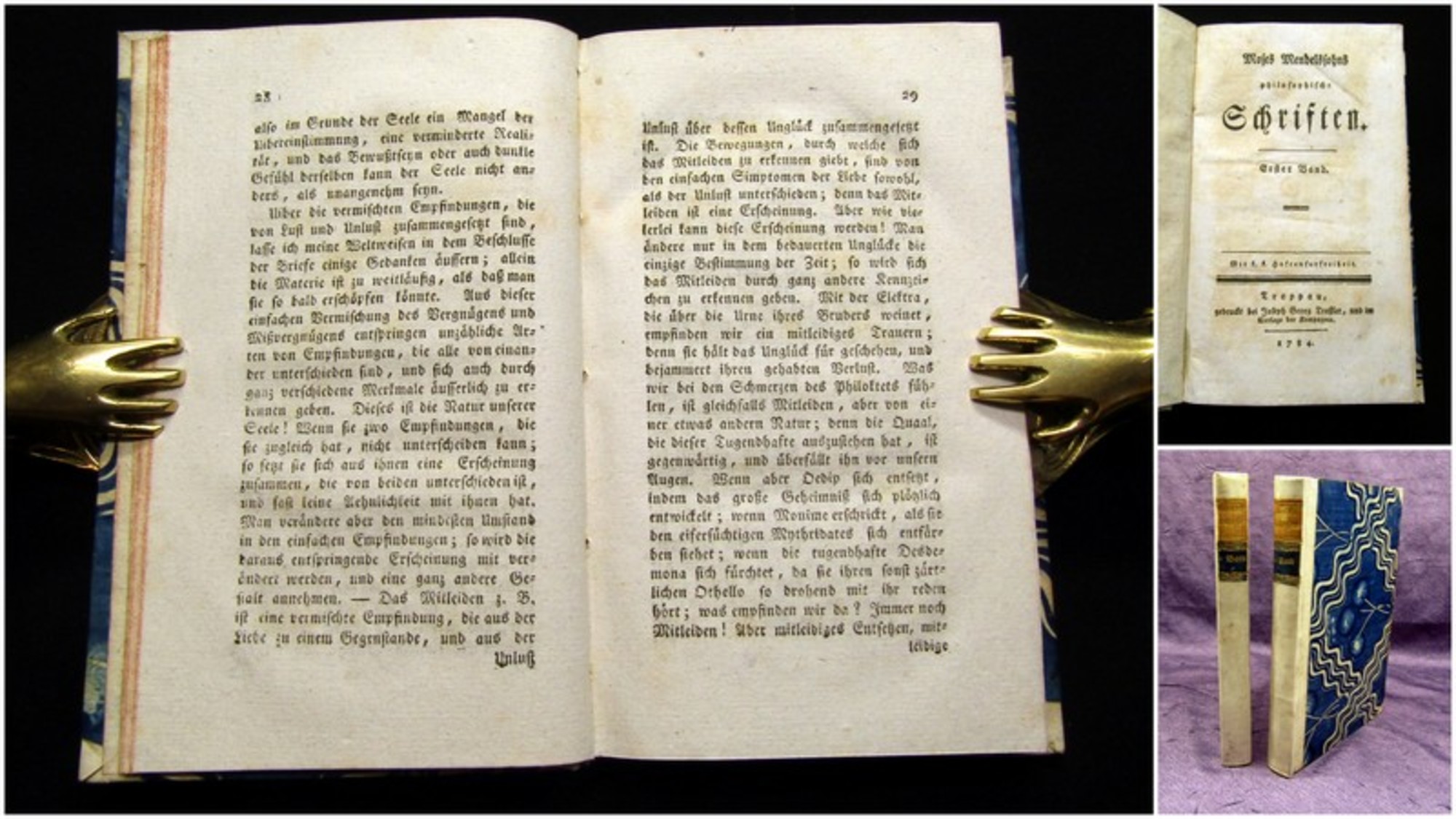 Mendelssohn, Moses. Moses Mendelssohn`s philosophische Schriften - 2 Bde. Troppau, Trassler, 1784. kl 8°(18x11cm), 268 S., 168 S., neue Halbpergamenteinbände. Eines der bekanntesten Werke des Verfassers. Kleine philosophische Schriften. Mit einer Skizze seines Lebens und Charakters von D. Jenisch. - Einbände leicht berieben und bestoßen, rot marmorierter Rundumschnitt, Papier altersbedingt gebräunt und leicht braunfleckig. Bestell-Nr: 13-0-57..........verkauft | ![]() | |