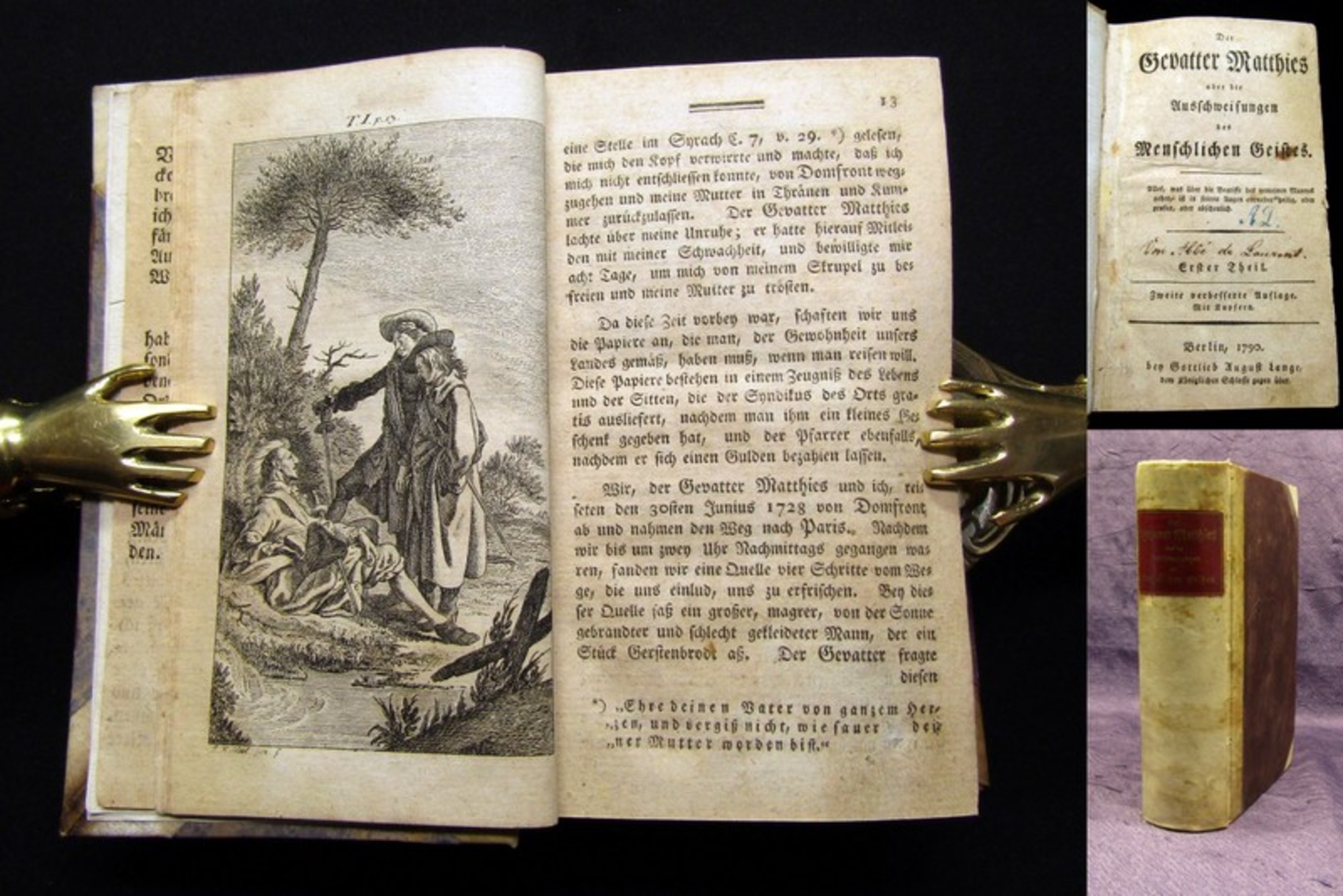 Dulaurens, H.J.. Der Gevatter Matthies, oder die Ausschweifungen des menschlichen Geistes. - 3 Teile in 1 Bd.. Berlin, Lange, G.A., 1790. kl 8°(17x11cm), 3 Titelvignetten, 2 Kupfertafeln, 5 Bll., 246 S., 272 S., 312 S., Halbpergamenteinband. Hayn-Got. IV, 434 - Erstauflage. Die berühmte antireligiöse Schrift in einer Mischauflage, von Hayn-Got. jeweils als "sehr selten, gesucht" vermerkt. - Einband berieben und bestoßen, hs. Rs., Titel mit hs. Vermerken, einzelne restaurierte Seiten mit teilw. Textverlust, Vorsätze vor jew. Titeln neu eingebunden, Papier altersbedingt gebräunt. Bestell-Nr: 13-0-58..........verkauft | ![]() | |