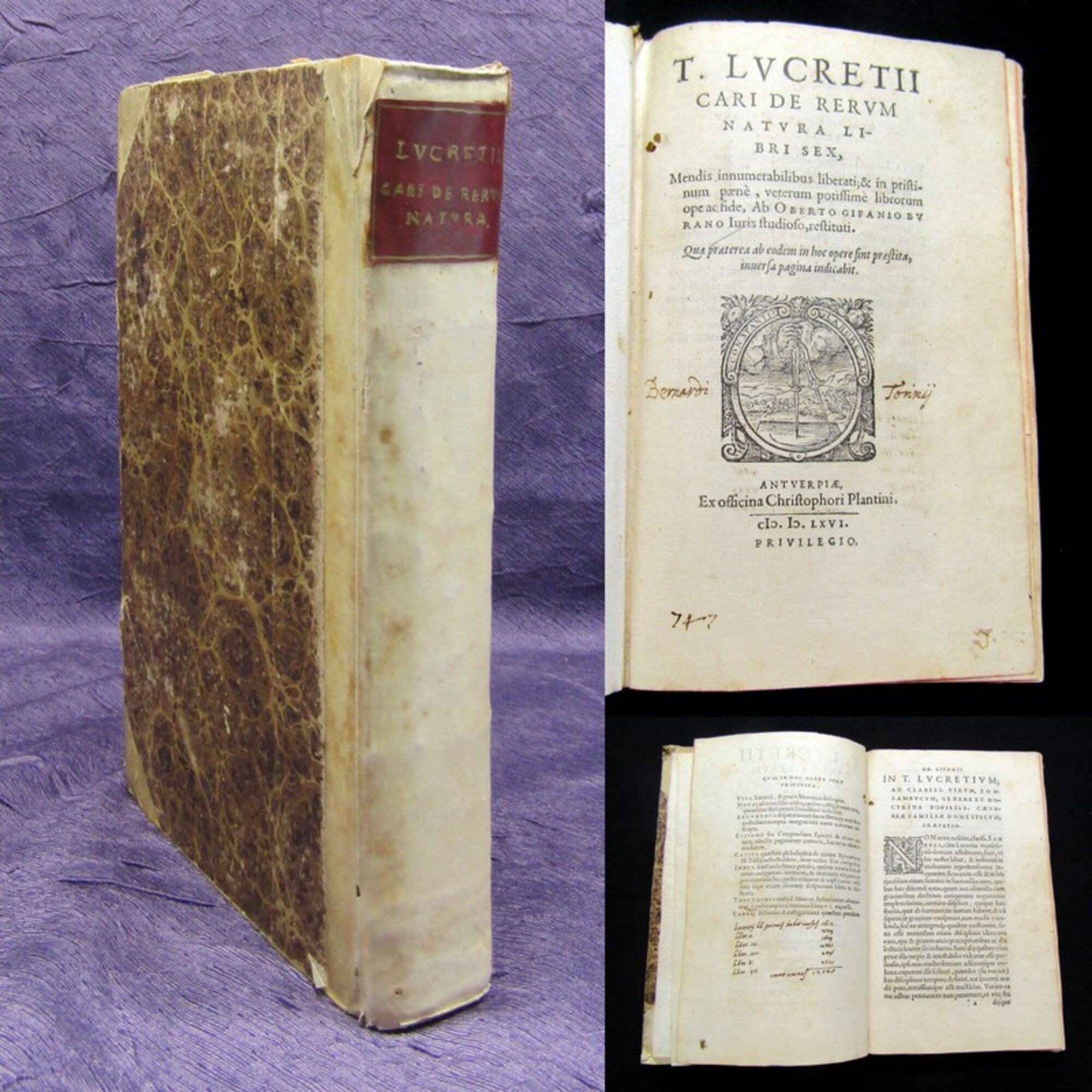 Lucretius Carus, Titus. T. Lucretii Cari de Rerum natura libri sex. Antwerpen, Plantin, 1566. kl 8°(17x12cm), Titelvignette, 24 Bll., 477 S., Halbpergament d. Zt.. Ebert I/12439 - De rerum natura ist ein aus dem 1. Jahrhundert v. Chr. stammendes Lehrgedicht des römischen Dichters, Philosophen und Epikureers Titus Lucretius Carus, genannt Lukrez. Die Hommage an Epikur handelt von der Stellung des Menschen in einem von den Göttern nicht beeinflussten Universum. - Einband berieben und bestoßen, hs. Rs., roter Rundumschnitt, Titel mit alten Namenzug, Papier altersbedingt gebräunt, erste Seiten wasserrandig, stellenw. braunfleckig. - Selten!. Bestell-Nr: 13-0-60..........verkauft | ![]() | |
