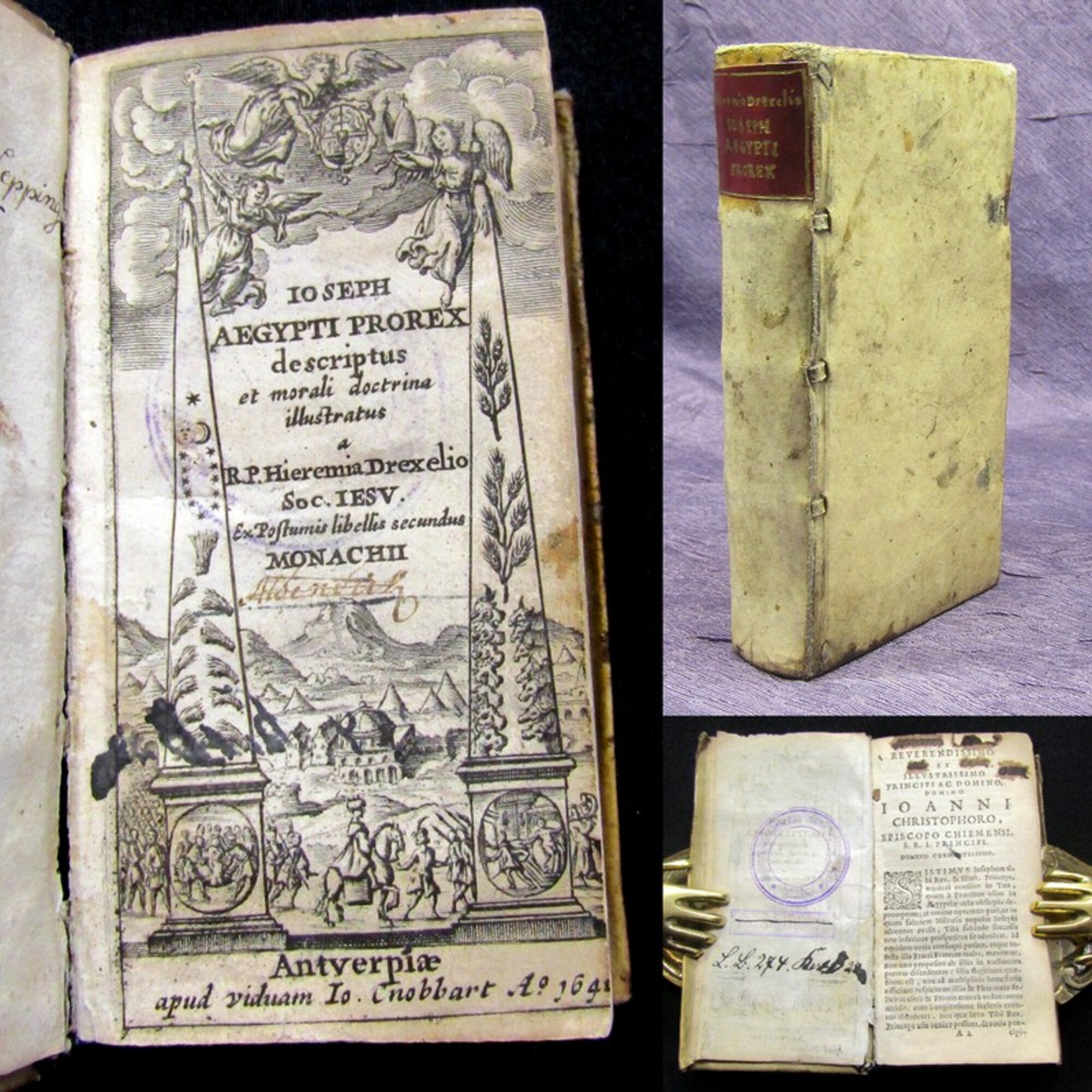 Drexel, Jeremias. Ioseph Aegypti Prorex descriptus et moralis doctrina illustratus. Antwerpen, Cnobbaert, 1641. 12°(12x6cm), Kupfertitel v. Dünnhaput, alter Bibliotheksstempel, 6 Bll., 321 S., Pergamenteiband mit spanischen Kanten. Dünnhaupt 26.2; Pörnbacher 189,22; Jantz II, 859 - "Symbolisch-moralische" Auslagung der Josephslegende. - Einband berieben, stark bestoßen und angeschmutzt, hs. Rs., Spiegel und Vorsatz mit hs. Vermerken, erstes Bl. mit Tintenflecken, Papier altersbedingt gebräunt und mit durchgehendem, dünnen Feuchtigkeitsrand. Bestell-Nr: 13-0-63..........verkauft | ![]() | |