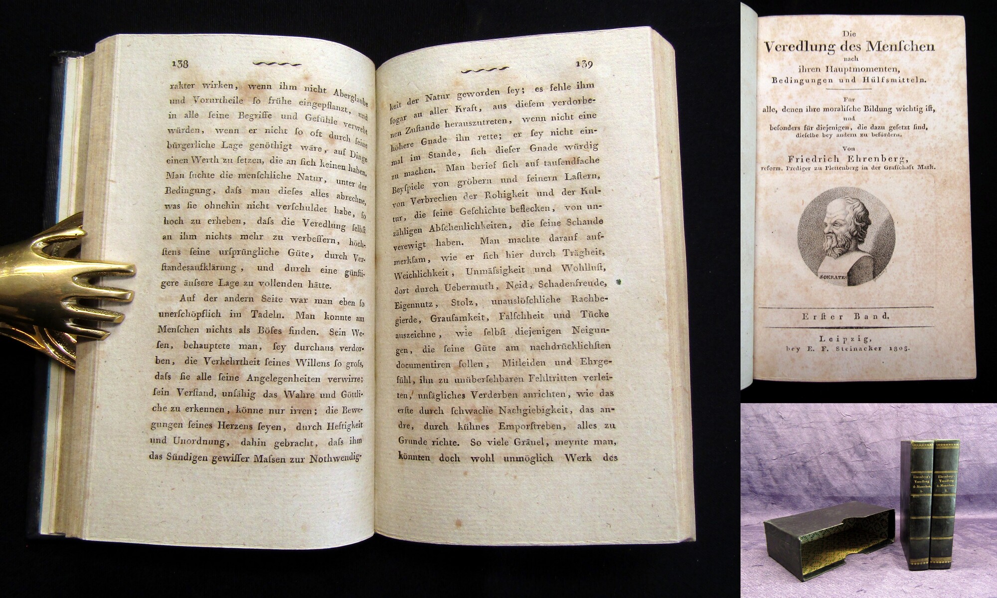 Ehrenberg, Friedrich. Die Veredlung des Menschen nach ihren Hauptmomenten, Bedingungen und Hülfsmitteln. - Für alle, denen ihre moralische Bildung wichtig ist, und besonders für diejenigen, die dazu gesetzt sind, dieselbe bey anderen zu befördern.. Leipzig, Steinacker, 1805. kl8!(15x10cm), XVI, (1), 405 S., 1 nn.S., VI, 569 S., 1nn.S., Ledereinbände d. Zt. im Pappschuber. Seltenes Exemplar! Friedrich Ehrenberg war ein deutscher reformierter Theologe und Schriftsteller. - Einbände berieben und bestoßen, ebenso der Pappschuber, Goldprägung am Rpcken, goldener Rundumschnitt, Papier altersbedingt gebräunt und braunfleckig. Bestell-Nr: 13-0-66..........240,00 € (inkl. MwSt. zzgl. Versand) | ![]() | |