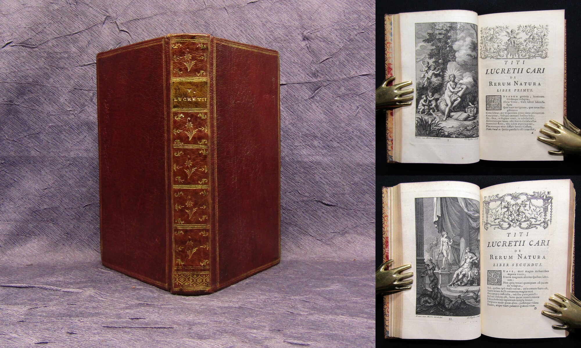 Lucretius Carus, Titus. Titi Lucretii Cari de Rerum natura libri sex. Paris, A. Coustelier, 1744. kl 8°(14,5x9cm), mit gest. Front. und 6 Kupfertafeln von Duflos nach Franz von Mieris, sowie 6 gest. Kopfvignetten, XXXVI, 288 S., geglätteter roter Maroquineinband (Rokoko) mit reichhaltig floral goldgepr. Rücken, Steh- und Innenkantenvergoldung, signiert "S". De rerum natura ist ein aus dem 1. Jahrhundert v. Chr. stammendes Lehrgedicht des römischen Dichters, Philosophen und Epikureers Titus Lucretius Carus, genannt Lukrez. Die Hommage an Epikur handelt von der Stellung des Menschen in einem von den Göttern nicht beeinflussten Universum. - Französischer Rokokoeinband mit geringen Gebrauchsspuren, signiert mit goldenem "S" auf vorderem Spiegel. Papier altersbedingt etwas gebräunt, nahezu fleckenfrei und in kräftigen Abdrücken. Sehr schönes, sauberes Exemplar. Bestell-Nr: 13-0-72..........verkauft | ![]() | |